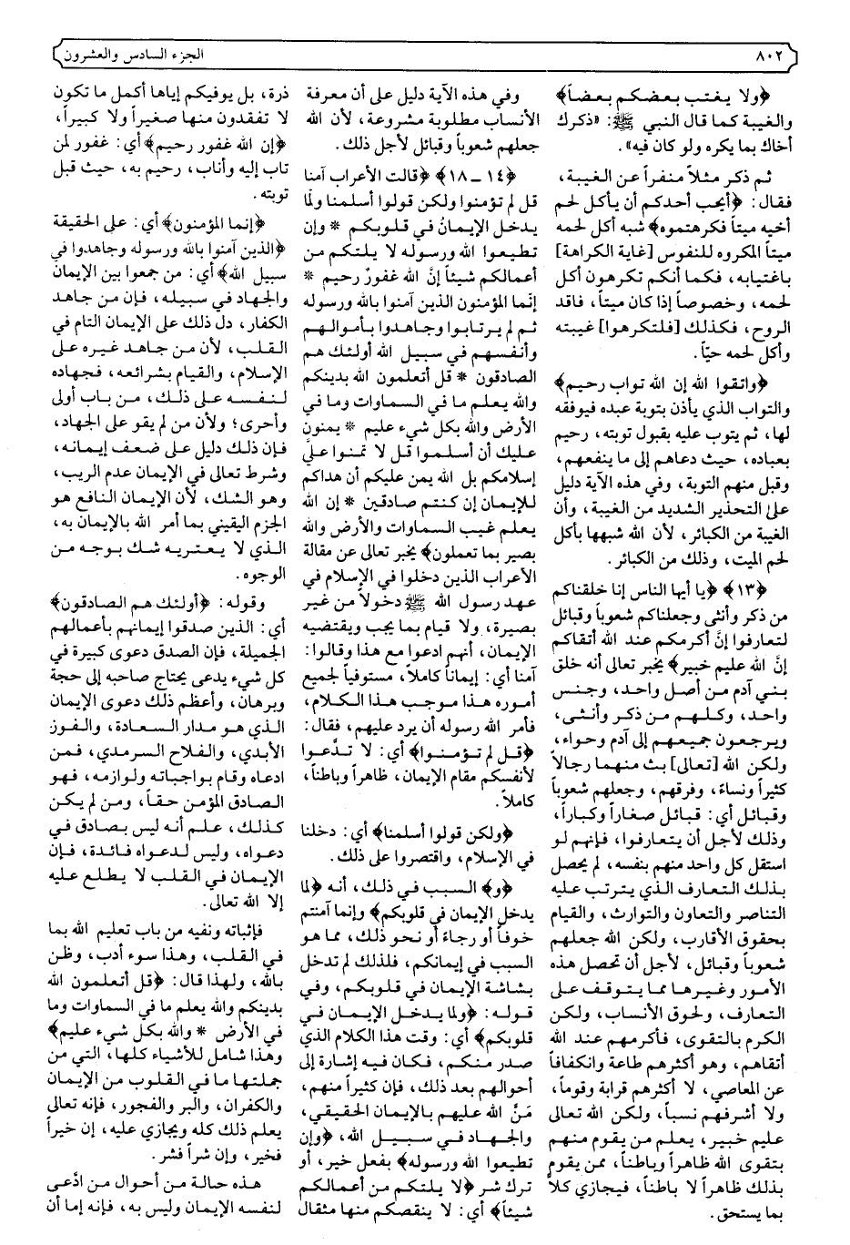 {14-18} {قَالَتِ الأعْرَابُ آمَنَّا قُلْ لَمْ تُؤْمِنُوا وَلَكِنْ قُولُوا أَسْلَمْنَا وَلَمَّا يَدْخُلِ الإيمَانُ فِي قُلُوبِكُمْ وَإِنْ تُطِيعُوا اللَّهَ وَرَسُولَهُ لا يَلِتْكُمْ مِنْ أَعْمَالِكُمْ شَيْئًا إِنَّ اللَّهَ غَفُورٌ رَحِيمٌ * إِنَّمَا الْمُؤْمِنُونَ الَّذِينَ آمَنُوا بِاللَّهِ وَرَسُولِهِ ثُمَّ لَمْ يَرْتَابُوا وَجَاهَدُوا بِأَمْوَالِهِمْ وَأَنْفُسِهِمْ فِي سَبِيلِ اللَّهِ أُولَئِكَ هُمُ الصَّادِقُونَ * قُلْ أَتُعَلِّمُونَ اللَّهَ بِدِينِكُمْ وَاللَّهُ يَعْلَمُ مَا فِي السَّمَاوَاتِ وَمَا فِي الأرْضِ وَاللَّهُ بِكُلِّ شَيْءٍ عَلِيمٌ * يَمُنُّونَ عَلَيْكَ أَنْ أَسْلَمُوا قُلْ لا تَمُنُّوا عَلَيَّ إِسْلامَكُمْ بَلِ اللَّهُ يَمُنُّ عَلَيْكُمْ أَنْ هَدَاكُمْ لِلإيمَانِ إِنْ كُنْتُمْ صَادِقِينَ * إِنَّ اللَّهَ يَعْلَمُ غَيْبَ السَّمَاوَاتِ وَالأرْضِ وَاللَّهُ بَصِيرٌ بِمَا تَعْمَلُونَ} .