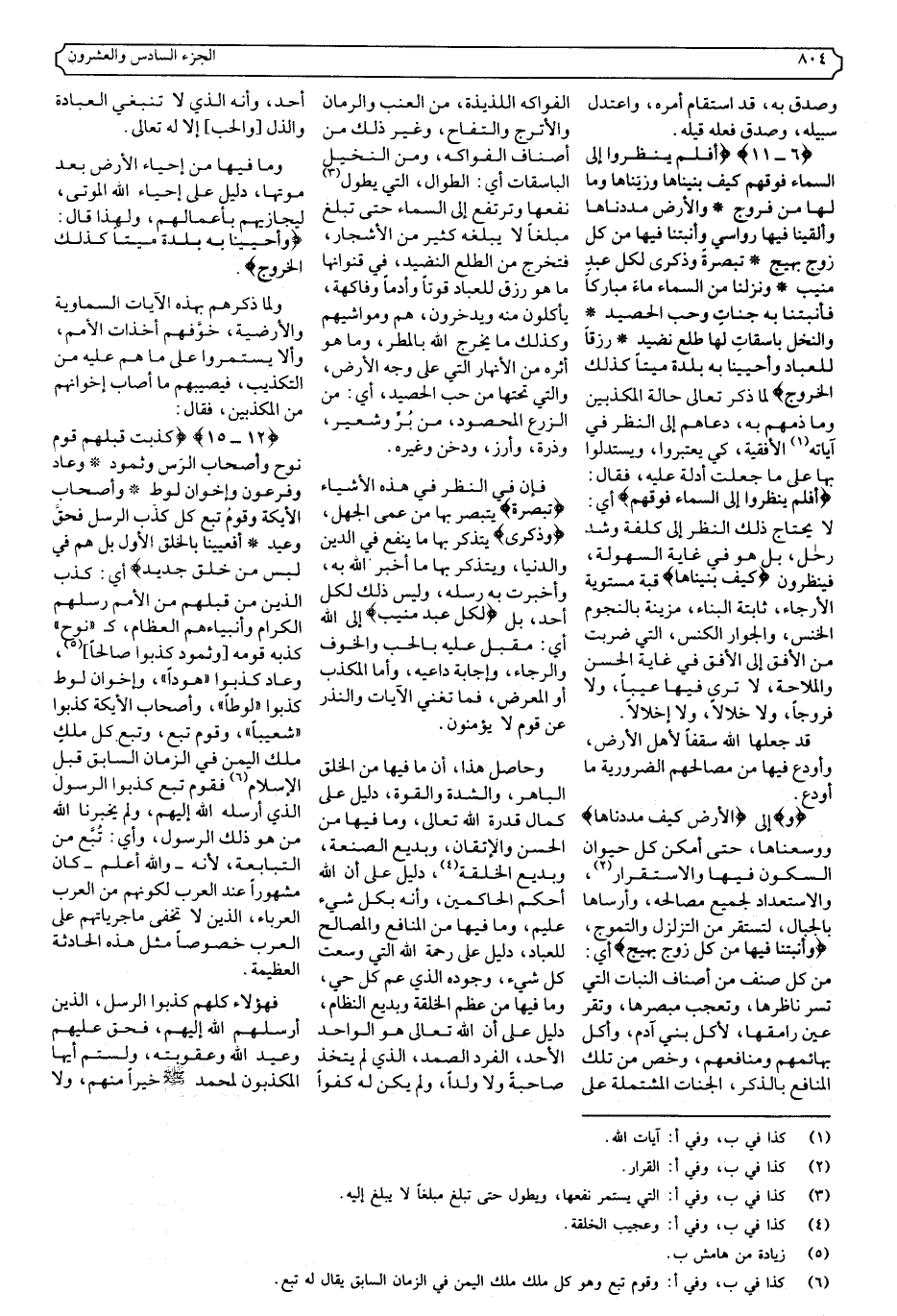 {6-11} {أَفَلَمْ يَنْظُرُوا إِلَى السَّمَاءِ فَوْقَهُمْ كَيْفَ بَنَيْنَاهَا وَزَيَّنَّاهَا وَمَا لَهَا مِنْ فُرُوجٍ * وَالأرْضَ مَدَدْنَاهَا وَأَلْقَيْنَا فِيهَا رَوَاسِيَ وَأَنْبَتْنَا فِيهَا مِنْ كُلِّ زَوْجٍ بَهِيجٍ * تَبْصِرَةً وَذِكْرَى لِكُلِّ عَبْدٍ مُنِيبٍ * وَنَزَّلْنَا مِنَ السَّمَاءِ مَاءً مُبَارَكًا فَأَنْبَتْنَا بِهِ جَنَّاتٍ وَحَبَّ الْحَصِيدِ * وَالنَّخْلَ بَاسِقَاتٍ لَهَا طَلْعٌ نَضِيدٌ * رِزْقًا لِلْعِبَادِ وَأَحْيَيْنَا بِهِ بَلْدَةً مَيْتًا كَذَلِكَ الْخُرُوجُ} .