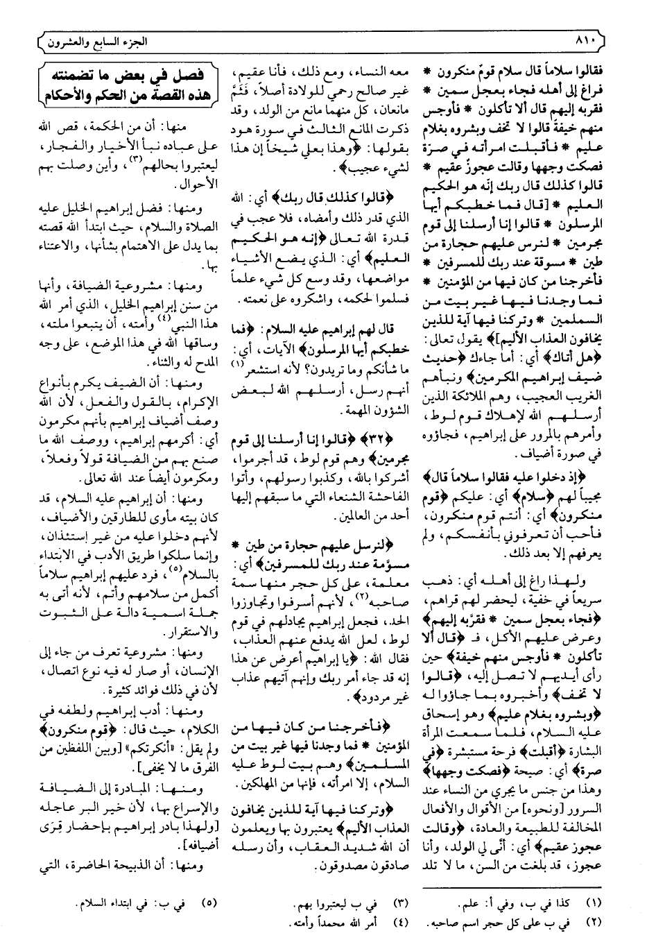 ومنها: أن إبراهيم عليه السلام، قد كان بيته، مأوى للطارقين والأضياف، لأنهم دخلوا عليه من غير استئذان، وإنما سلكوا طريق الأدب، في الابتداء السلام (5) فرد عليهم إبراهيم سلامًا، أكمل من سلامهم وأتم، لأنه أتى به جملة اسمية، دالة على الثبوت والاستمرار.