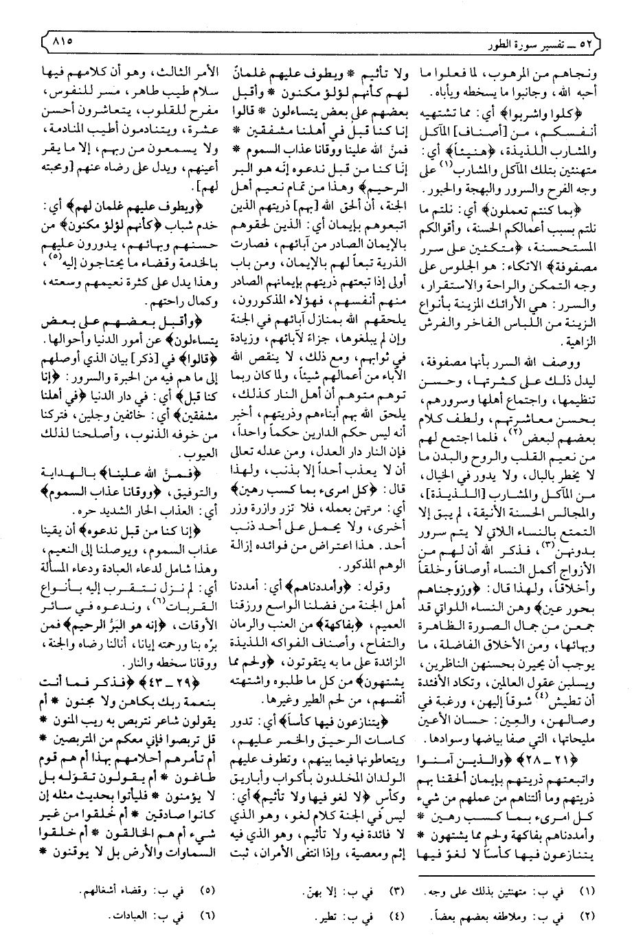 {21-28} {وَالَّذِينَ آمَنُوا وَاتَّبَعَتْهُمْ ذُرِّيَّتُهُمْ بِإِيمَانٍ أَلْحَقْنَا بِهِمْ ذُرِّيَّتَهُمْ وَمَا أَلَتْنَاهُمْ مِنْ عَمَلِهِمْ مِنْ شَيْءٍ كُلُّ امْرِئٍ بِمَا كَسَبَ رَهِينٌ * وَأَمْدَدْنَاهُمْ بِفَاكِهَةٍ وَلَحْمٍ مِمَّا يَشْتَهُونَ * يَتَنَازَعُونَ فِيهَا كَأْسًا لا لَغْوٌ فِيهَا وَلا تَأْثِيمٌ * وَيَطُوفُ عَلَيْهِمْ غِلْمَانٌ لَهُمْ كَأَنَّهُمْ لُؤْلُؤٌ مَكْنُونٌ * وَأَقْبَلَ بَعْضُهُمْ عَلَى بَعْضٍ يَتَسَاءَلُونَ * قَالُوا إِنَّا كُنَّا قَبْلُ فِي أَهْلِنَا مُشْفِقِينَ * فَمَنَّ اللَّهُ عَلَيْنَا وَوَقَانَا عَذَابَ السَّمُومِ * إِنَّا كُنَّا مِنْ قَبْلُ نَدْعُوهُ إِنَّهُ هُوَ الْبَرُّ الرَّحِيمُ} .