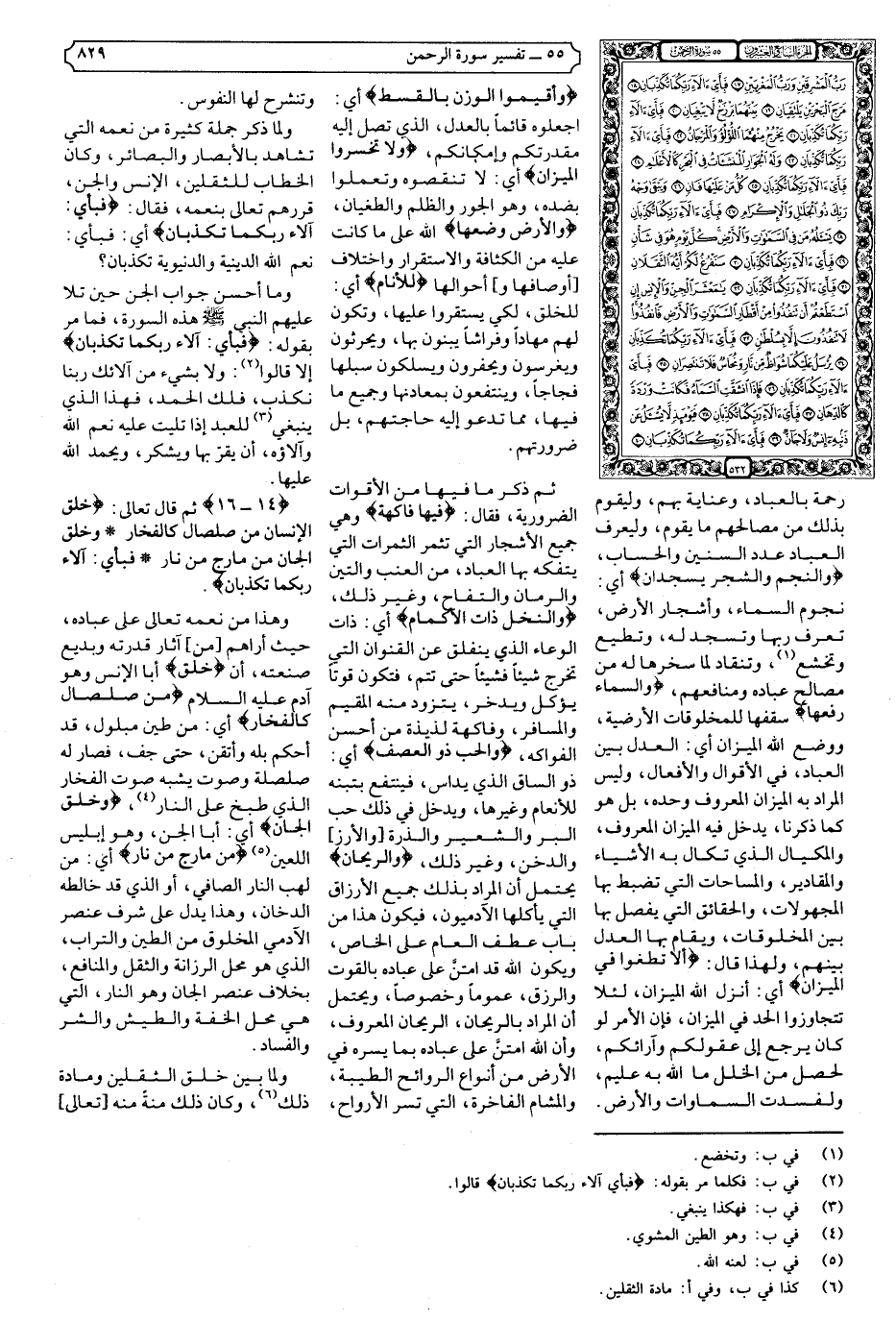 {وَخَلَقَ الْجَانَّ} أي: أبا الجن، وهو إبليس اللعين (2) {مِنْ مَارِجٍ مِنْ نَارٍ} أي: من لهب النار الصافي، أو الذي قد خالطه الدخان، وهذا يدل على شرف عنصر الآدمي المخلوق من الطين والتراب، الذي هو محل الرزانة والثقل والمنافع، بخلاف عنصر الجان وهو النار، التي هي محل الخفة والطيش والشر والفساد.