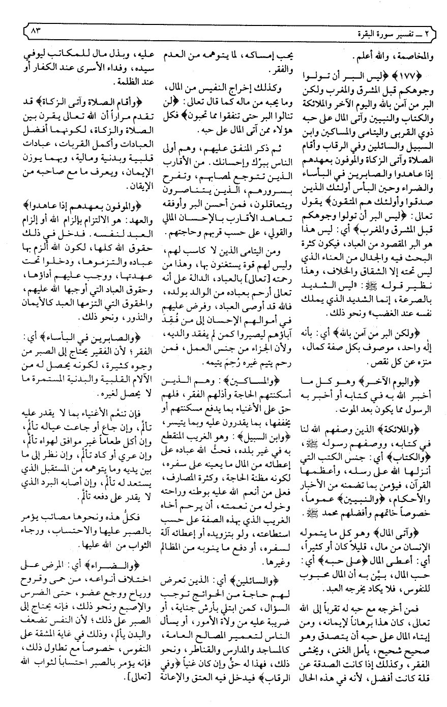 {177} {لَيْسَ الْبِرَّ أَنْ تُوَلُّوا وُجُوهَكُمْ قِبَلَ الْمَشْرِقِ وَالْمَغْرِبِ وَلَكِنَّ الْبِرَّ مَنْ آمَنَ بِاللَّهِ وَالْيَوْمِ الآخِرِ وَالْمَلائِكَةِ وَالْكِتَابِ وَالنَّبِيِّينَ وَآتَى الْمَالَ عَلَى حُبِّهِ ذَوِي الْقُرْبَى وَالْيَتَامَى وَالْمَسَاكِينَ وَابْنَ السَّبِيلِ وَالسَّائِلِينَ وَفِي الرِّقَابِ وَأَقَامَ الصَّلاةَ وَآتَى الزَّكَاةَ وَالْمُوفُونَ بِعَهْدِهِمْ إِذَا عَاهَدُوا وَالصَّابِرِينَ فِي الْبَأْسَاءِ وَالضَّرَّاءِ وَحِينَ الْبَأْسِ أُولَئِكَ الَّذِينَ صَدَقُوا وَأُولَئِكَ هُمُ الْمُتَّقُونَ} .