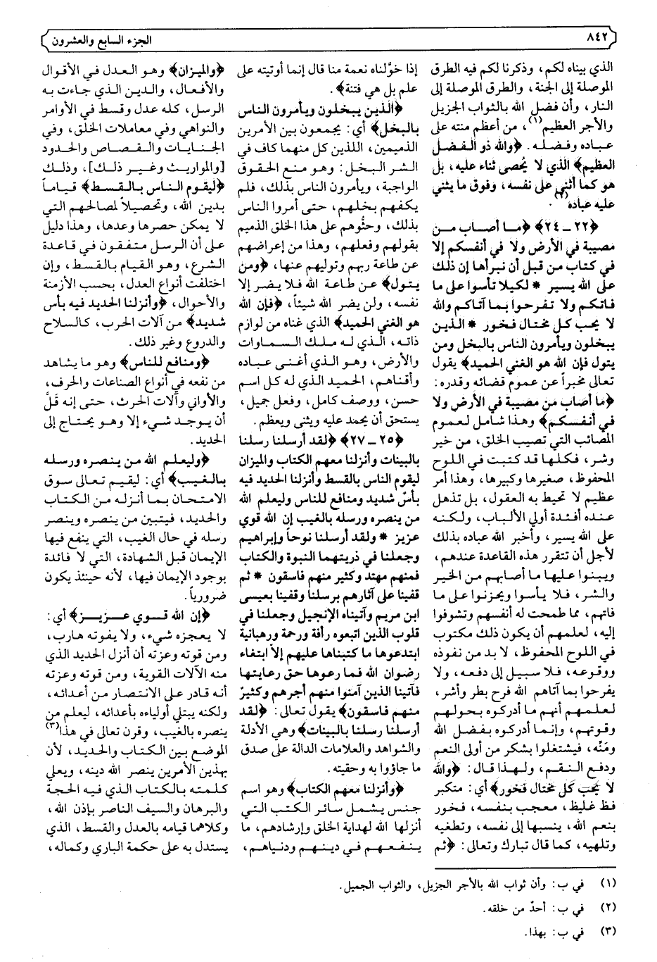 {25-27} {لَقَدْ أَرْسَلْنَا رُسُلَنَا بِالْبَيِّنَاتِ وَأَنْزَلْنَا مَعَهُمُ الْكِتَابَ وَالْمِيزَانَ لِيَقُومَ النَّاسُ بِالْقِسْطِ وَأَنْزَلْنَا الْحَدِيدَ فِيهِ بَأْسٌ شَدِيدٌ وَمَنَافِعُ لِلنَّاسِ وَلِيَعْلَمَ اللَّهُ مَنْ يَنْصُرُهُ وَرُسُلَهُ بِالْغَيْبِ إِنَّ اللَّهَ قَوِيٌّ عَزِيزٌ * وَلَقَدْ أَرْسَلْنَا نُوحًا وَإِبْرَاهِيمَ وَجَعَلْنَا فِي ذُرِّيَّتِهِمَا النُّبُوَّةَ وَالْكِتَابَ فَمِنْهُمْ مُهْتَدٍ وَكَثِيرٌ مِنْهُمْ فَاسِقُونَ * ثُمَّ قَفَّيْنَا عَلَى آثَارِهِمْ بِرُسُلِنَا وَقَفَّيْنَا بِعِيسَى ابْنِ مَرْيَمَ وَآتَيْنَاهُ الإنْجِيلَ وَجَعَلْنَا فِي قُلُوبِ الَّذِينَ اتَّبَعُوهُ رَأْفَةً وَرَحْمَةً وَرَهْبَانِيَّةً ابْتَدَعُوهَا مَا كَتَبْنَاهَا عَلَيْهِمْ إِلا ابْتِغَاءَ رِضْوَانِ اللَّهِ فَمَا رَعَوْهَا حَقَّ رِعَايَتِهَا فَآتَيْنَا الَّذِينَ آمَنُوا مِنْهُمْ أَجْرَهُمْ وَكَثِيرٌ مِنْهُمْ فَاسِقُونَ} .