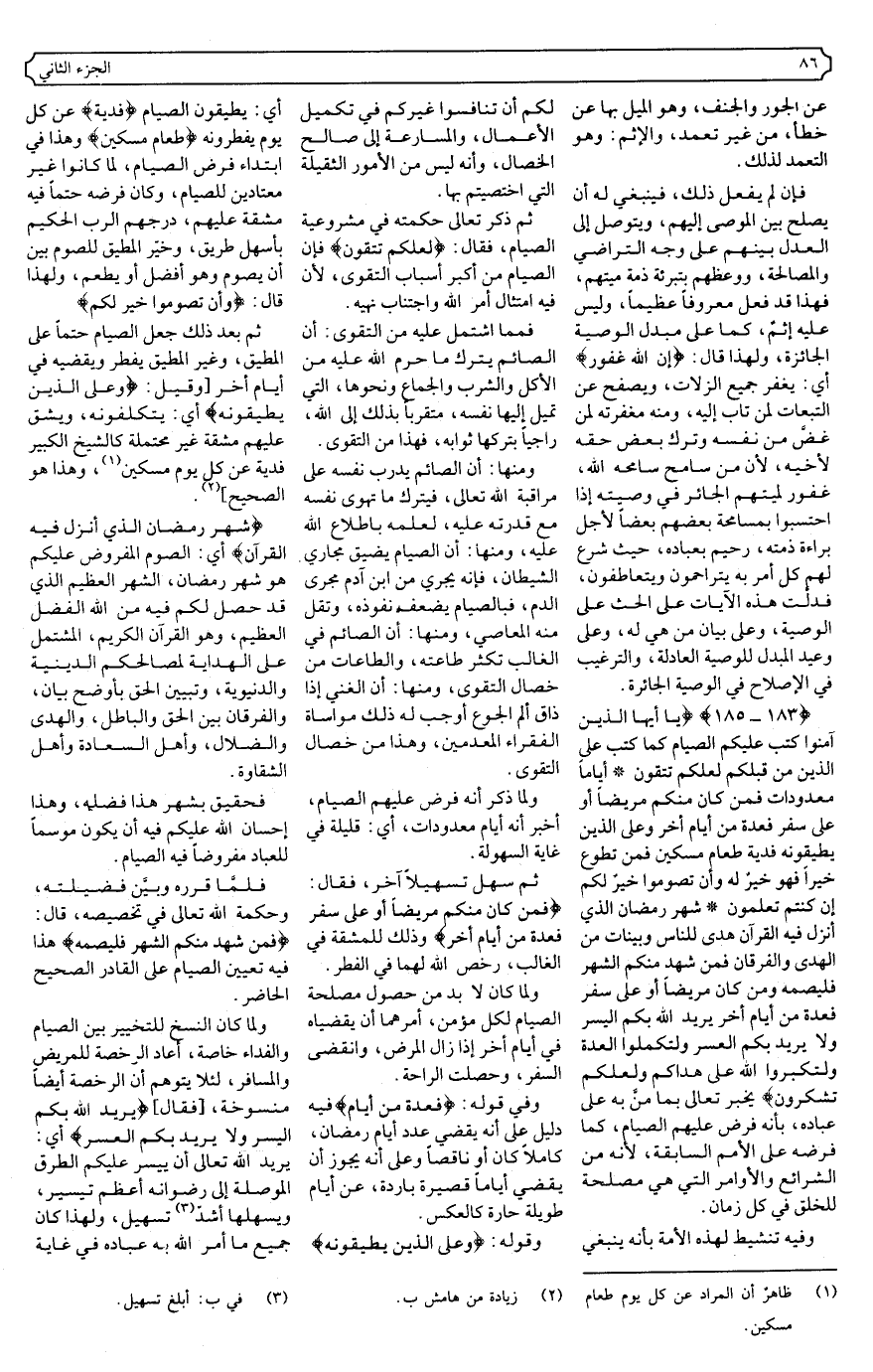 {183 - 185} {يَا أَيُّهَا الَّذِينَ آمَنُوا كُتِبَ عَلَيْكُمُ الصِّيَامُ كَمَا كُتِبَ عَلَى الَّذِينَ مِنْ قَبْلِكُمْ لَعَلَّكُمْ تَتَّقُونَ * أَيَّامًا مَعْدُودَاتٍ فَمَنْ كَانَ مِنْكُمْ مَرِيضًا أَوْ عَلَى سَفَرٍ فَعِدَّةٌ مِنْ أَيَّامٍ أُخَرَ وَعَلَى الَّذِينَ يُطِيقُونَهُ فِدْيَةٌ طَعَامُ مِسْكِينٍ فَمَنْ تَطَوَّعَ خَيْرًا فَهُوَ خَيْرٌ لَهُ وَأَنْ تَصُومُوا خَيْرٌ لَكُمْ إِنْ كُنْتُمْ تَعْلَمُونَ * شَهْرُ رَمَضَانَ الَّذِي أُنْزِلَ فِيهِ الْقُرْآنُ هُدًى لِلنَّاسِ وَبَيِّنَاتٍ مِنَ الْهُدَى وَالْفُرْقَانِ فَمَنْ شَهِدَ مِنْكُمُ الشَّهْرَ فَلْيَصُمْهُ وَمَنْ كَانَ مَرِيضًا أَوْ عَلَى سَفَرٍ فَعِدَّةٌ مِنْ أَيَّامٍ أُخَرَ يُرِيدُ اللَّهُ بِكُمُ الْيُسْرَ وَلا يُرِيدُ بِكُمُ الْعُسْرَ وَلِتُكْمِلُوا الْعِدَّةَ وَلِتُكَبِّرُوا اللَّهَ عَلَى مَا هَدَاكُمْ وَلَعَلَّكُمْ تَشْكُرُونَ} .