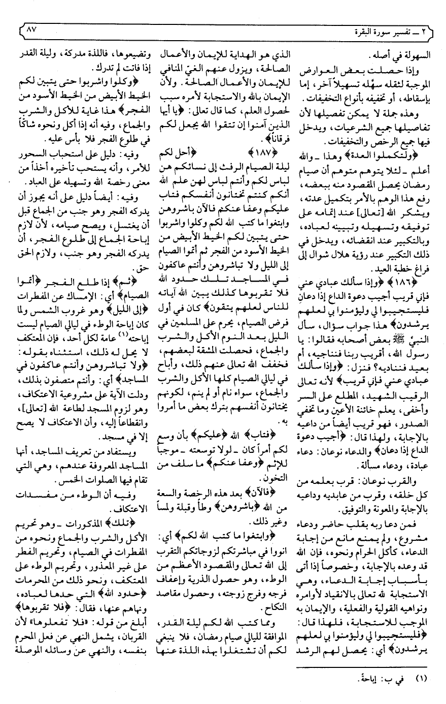 {187} . ثم قال تعالى: {أُحِلَّ لَكُمْ لَيْلَةَ الصِّيَامِ الرَّفَثُ إِلَى نِسَائِكُمْ هُنَّ لِبَاسٌ لَكُمْ وَأَنْتُمْ لِبَاسٌ لَهُنَّ عَلِمَ اللَّهُ أَنَّكُمْ كُنْتُمْ تَخْتَانُونَ أَنْفُسَكُمْ فَتَابَ عَلَيْكُمْ وَعَفَا عَنْكُمْ فَالآنَ بَاشِرُوهُنَّ وَابْتَغُوا مَا كَتَبَ اللَّهُ لَكُمْ وَكُلُوا وَاشْرَبُوا حَتَّى يَتَبَيَّنَ لَكُمُ الْخَيْطُ الأبْيَضُ مِنَ الْخَيْطِ الأسْوَدِ مِنَ الْفَجْرِ ثُمَّ أَتِمُّوا الصِّيَامَ إِلَى اللَّيْلِ وَلا تُبَاشِرُوهُنَّ وَأَنْتُمْ عَاكِفُونَ فِي الْمَسَاجِدِ تِلْكَ حُدُودُ اللَّهِ فَلا تَقْرَبُوهَا كَذَلِكَ يُبَيِّنُ اللَّهُ آيَاتِهِ لِلنَّاسِ لَعَلَّهُمْ يَتَّقُونَ} .