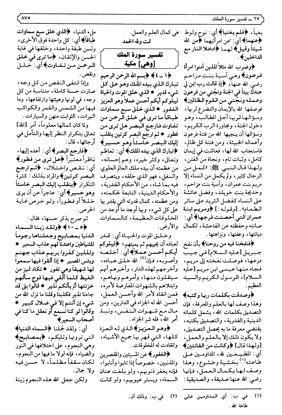 {1 - 4} {بِسْمِ اللَّهِ الرَّحْمَنِ الرَّحِيمِ تَبَارَكَ الَّذِي بِيَدِهِ الْمُلْكُ وَهُوَ عَلَى كُلِّ شَيْءٍ قَدِيرٌ * الَّذِي خَلَقَ الْمَوْتَ وَالْحَيَاةَ لِيَبْلُوَكُمْ أَيُّكُمْ أَحْسَنُ عَمَلا وَهُوَ الْعَزِيزُ الْغَفُورُ * الَّذِي خَلَقَ سَبْعَ سَمَاوَاتٍ طِبَاقًا مَا تَرَى فِي خَلْقِ الرَّحْمَنِ مِنْ تَفَاوُتٍ فَارْجِعِ الْبَصَرَ هَلْ تَرَى مِنْ فُطُورٍ * ثُمَّ ارْجِعِ الْبَصَرَ كَرَّتَيْنِ يَنْقَلِبْ إِلَيْكَ الْبَصَرُ خَاسِئًا وَهُوَ حَسِيرٌ} .