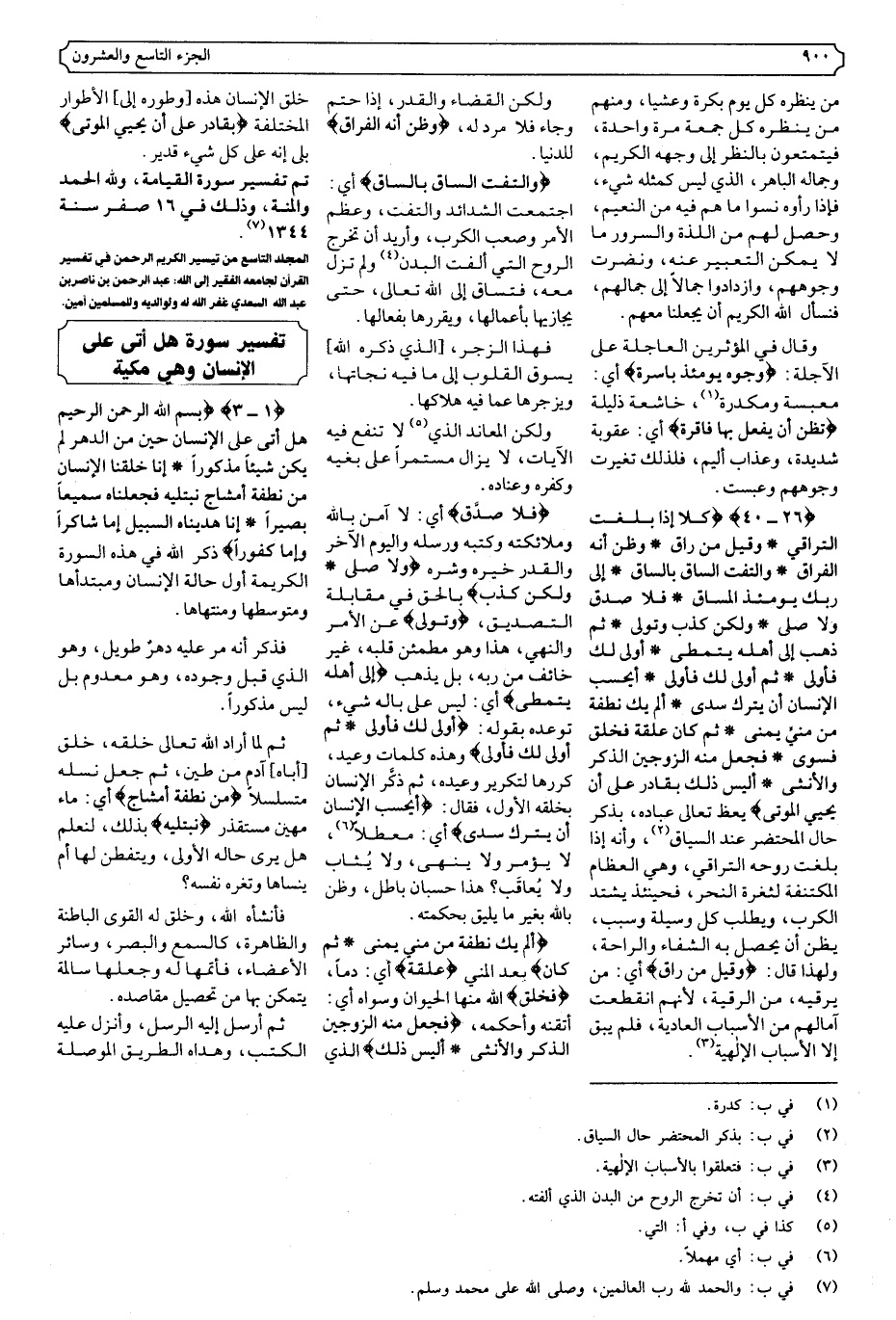 {أَلَمْ يَكُ نُطْفَةً مِنْ مَنِيٍّ يُمْنَى ثُمَّ كَانَ} بعد المني {عَلَقَةً} أي: دما، {فَخَلَقَ} الله منها الحيوان وسواه أي: أتقنه وأحكمه، {فَجَعَلَ مِنْهُ الزَّوْجَيْنِ الذَّكَرَ وَالأنْثَى أَلَيْسَ ذَلِكَ} الذي خلق الإنسان [وطوره إلى] هذه الأطوار المختلفة {بِقَادِرٍ عَلَى أَنْ يُحْيِيَ الْمَوْتَى} بلى إنه على كل شيء قدير. تم تفسير سورة القيامة، ولله الحمد والمنة، وذلك في 16 صفر سنة 1344 (6) .