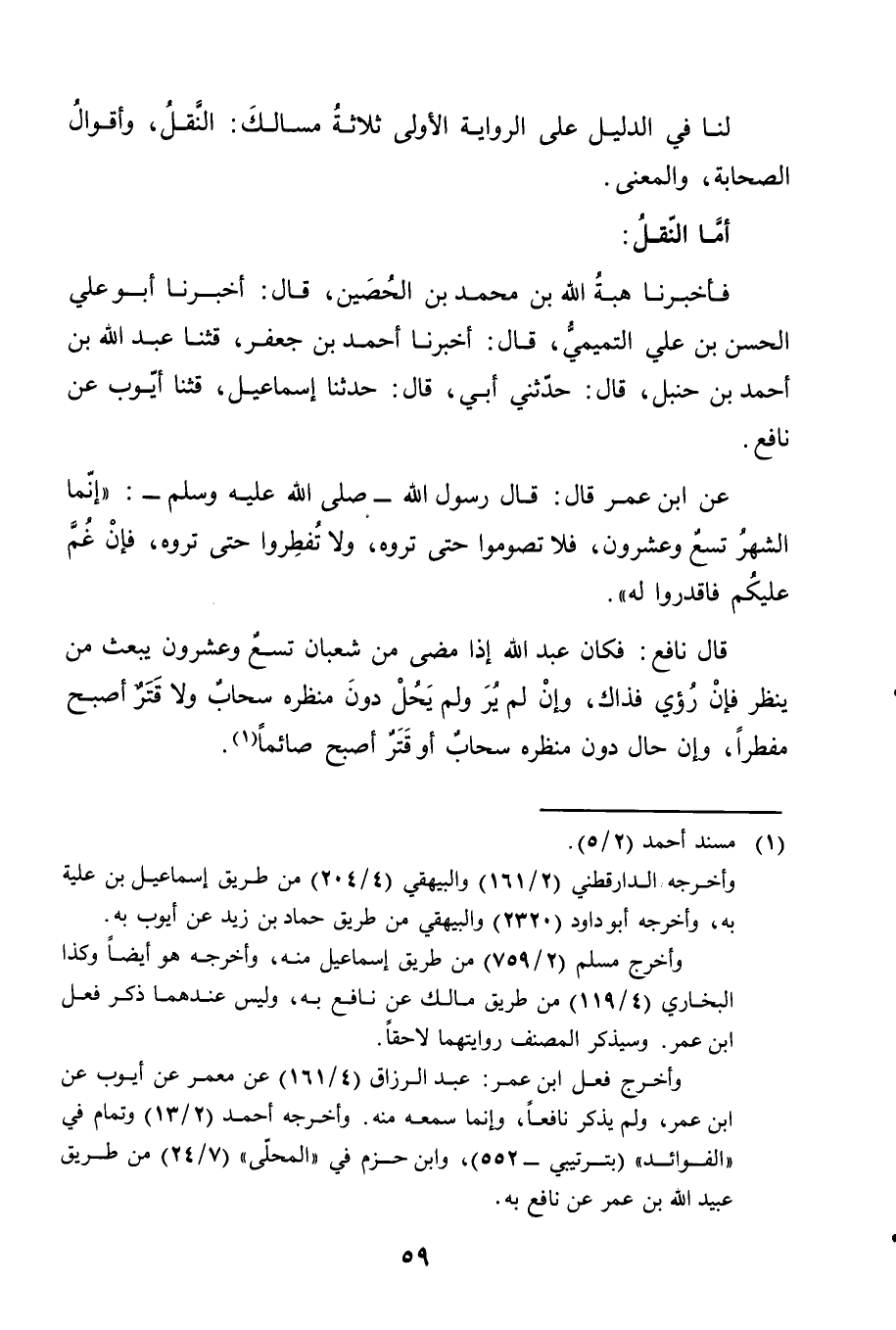 قال نافع: فكان عبد الله إذا مضى من شعبان تسعٌ وعشرون يبعث من ينظر فإن رؤي فذاك، وإن لم ير ولم يحل دون منظره سحابٌ ولا قترٌ أصبح مفطراً، وإن حال دون منظره سحابٌ أو قترٌ أصبح صائماً.