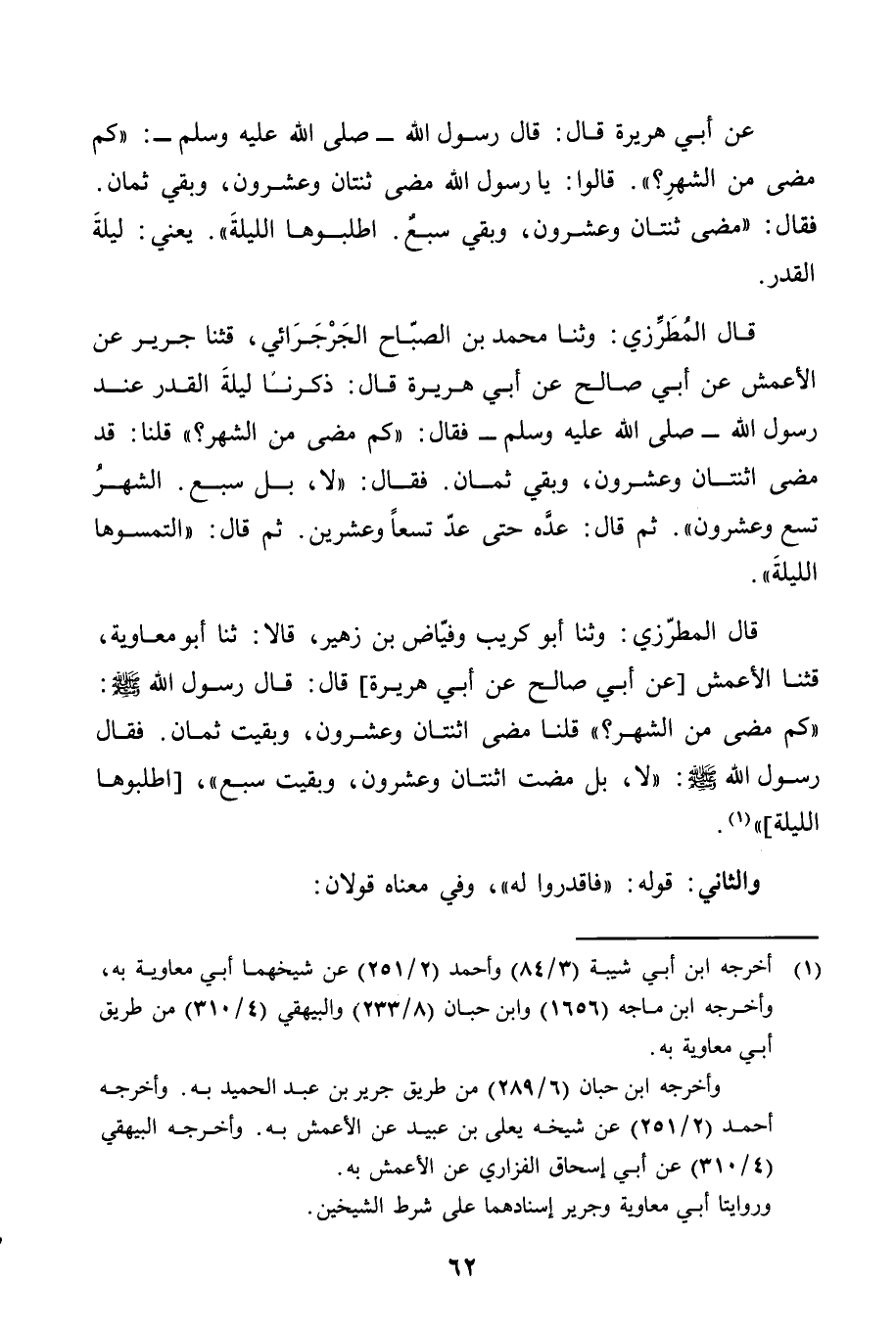 قال المطرزي: وثنا أبو كريب وفياض بن زهير، قالا: ثنا أبو معاوية، قثنا الأعمش [عن أبي صالح عن أبي هريرة] قال: قال رسول الله صلى الله عليه وسلم: ((كم مضى من الشهر؟)) قلنا مضى اثنتان وعشرون، وبقيت ثمان. فقال رسول الله صلى الله عليه وسلم: ((لا، بل مضت اثنتان وعشرون، وبقيت سبع))، [اطلبوها الليلة])).