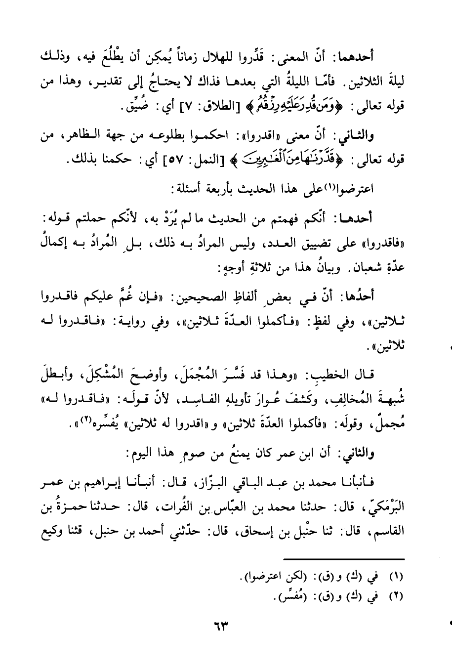 أحدها: أنكم فهمتم من الحديث ما لم يرد به، لأنكم حملتم قوله: ((فاقدروا)) على تضييق العدد، وليس المراد به ذلك، بل المراد به إكمال عدة شعبان. وبيان هذا من ثلاثة أوجهٍ: