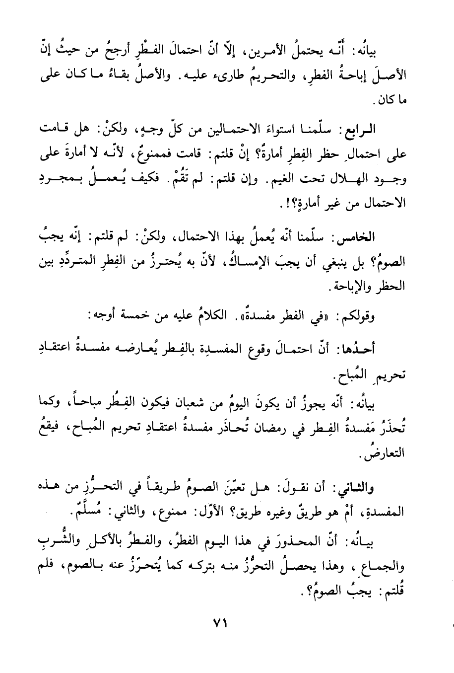 وقولكم: ((في الفطر مفسدةٌ)). الكلام عليه من خمسة أوجه: