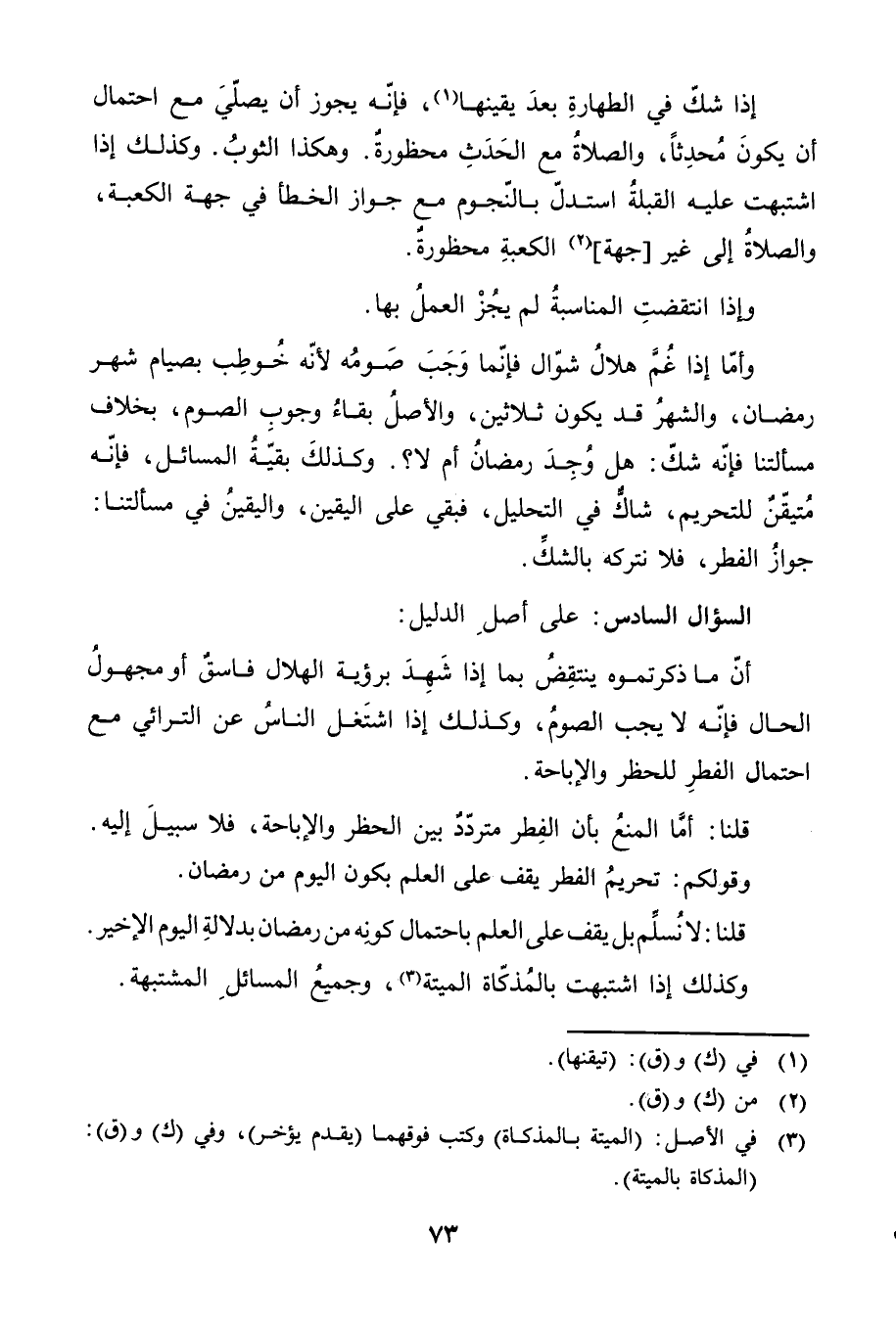 إذا شك في الطهارة بعد يقينها، فإنه يجوز أن يصلي مع احتمال أن يكون محدثاً، والصلاة مع الحدث محظورةٌ. وهكذا الثوب. وكذلك إذا اشتبهت عليه القبلة استدل بالنجوم مع جواز الخطأ في جهة الكعبة، والصلاة إلى غير [جهة] الكعبة محظورة.