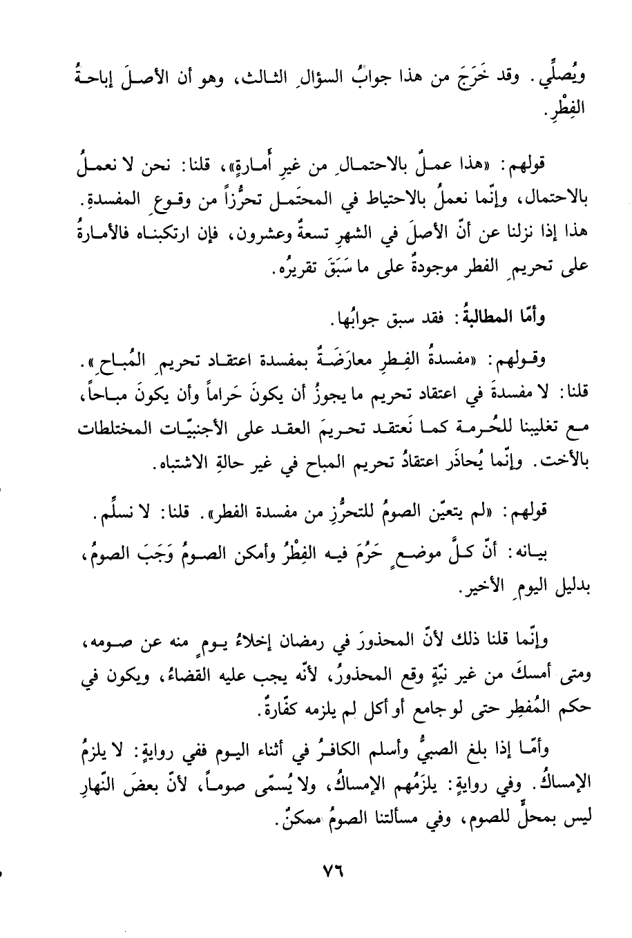 وقولهم: ((مفسدة الفطر معارضةٌ بمفسدة اعتقاد تحريم المباح)). قلنا: لا مفسدة في اعتقاد تحريم ما يجوز أن يكون حراماً وأن يكون مباحاً، مع تغليبنا للحرمة كما نعتقد تحريم العقد على الأجنبيات المختلطات بالأخت. وإنما يحاذر اعتقاد تحريم المباح في غير حالة الاشتباه.