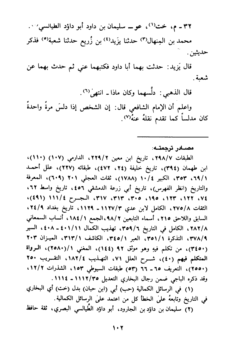 32 - م خت عو سليمان بن داود أبو داود الطيالسي محمد بن المنهال حدثنا يزيد بن زريع حدثنا شعبة فذكر حديثين قال يزيد حدثت بهما أبا داود فكتبهما عني ثم حدث بهما عن شعبة قال الذهبي دلسهما وكان ماذا انتهى واعلم ان الامام الشافعي قال ان الشخص إذا دلس مرة واحدة كان مدلسا كما تقدم نقله عنه