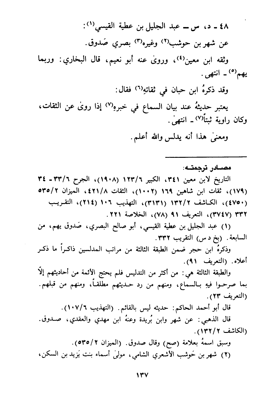 48 - د س عبد الجليل بن عطية القيسي عن شهر بن حوشب وغيره بصري صدوق وثقة بن معين وروى عنه أبو نعيم قال البخاري وربما يهم انتهى وقد ذكره بن حبان في ثقاته فقال يعتبر حديثه عند بيان السماع في خبره إذا روى عن الثقات وكان راوية ثبتا انتهى ومعنى هذا انه يدلس والله اعلم