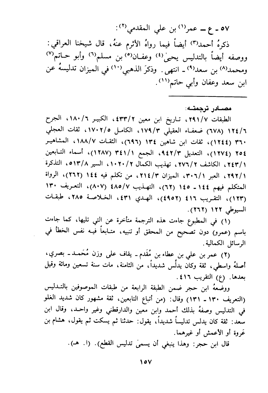 57 - ع عمر بن علي المقدمي ذكره احمد أيضا فيما رواه الأثرم عنه قال شيخنا العراقي ووصفه أيضا بالتدليس يحيى وعفان بن مسلم وأبو حاتم ومحمد بن سعد انتهى وذكر الذهبي في الميزان تدليسه عن بن سعد وعفان وأبي حاتم