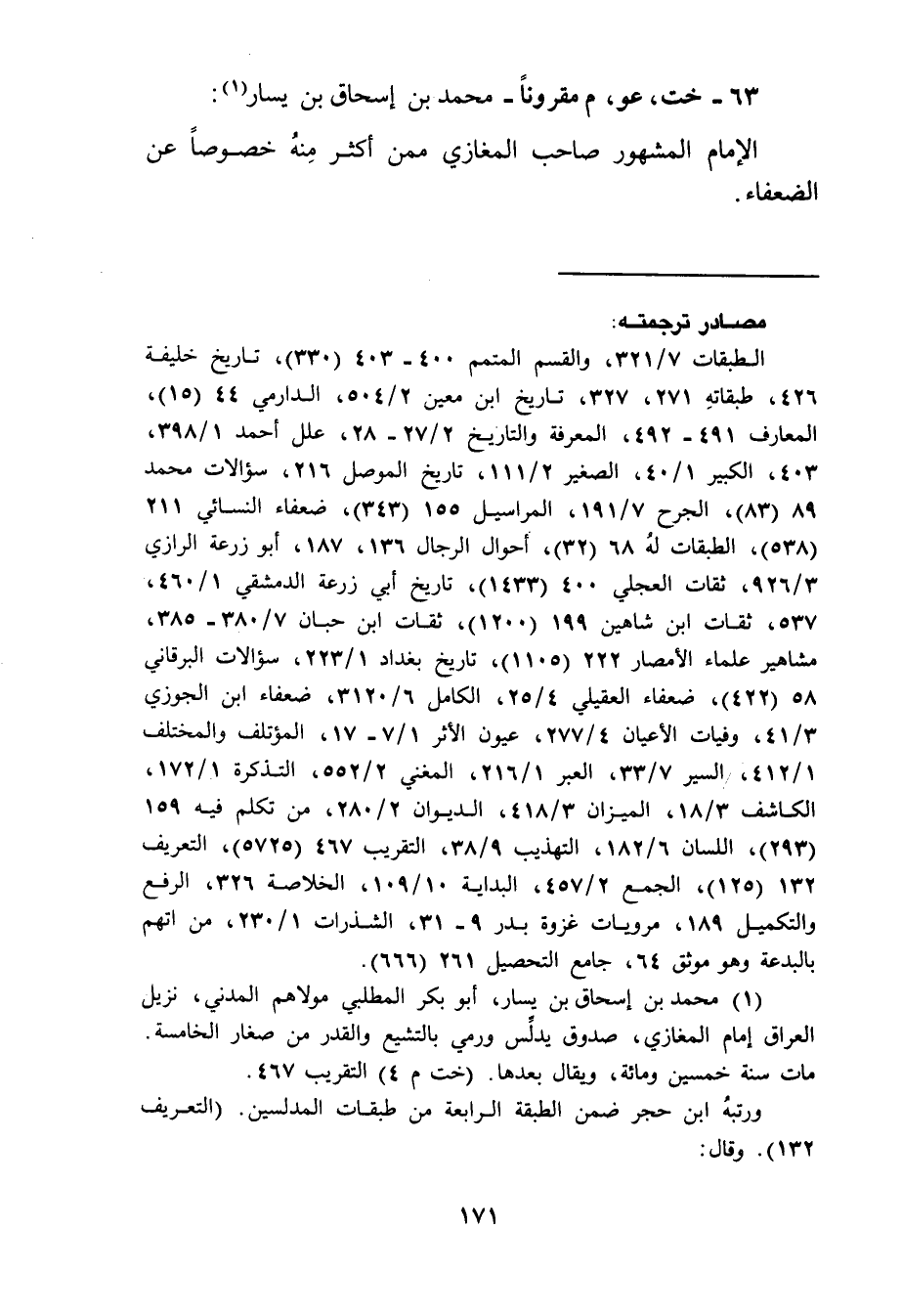 63 - خت عو م مقرونا محمد بن إسحاق بن يسار الامام المشهور صاحب المغازي ممن أكثر منه خصوصا عن الضعفاء