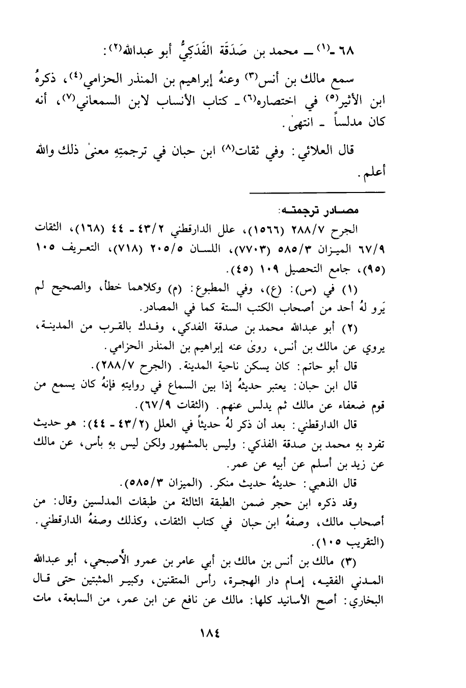68 - محمد بن صدقة الفدكي أبو عبد الله سمع مالك بن أنس وعنه إبراهيم بن المنذر الحزامي ذكره بن الأثير في اختصاره كتاب الأنساب لابن السمعاني انه كان مدلسا انتهى قال العلائي وفي ثقات بن حبان في ترجمته معنى ذل والله اعلم