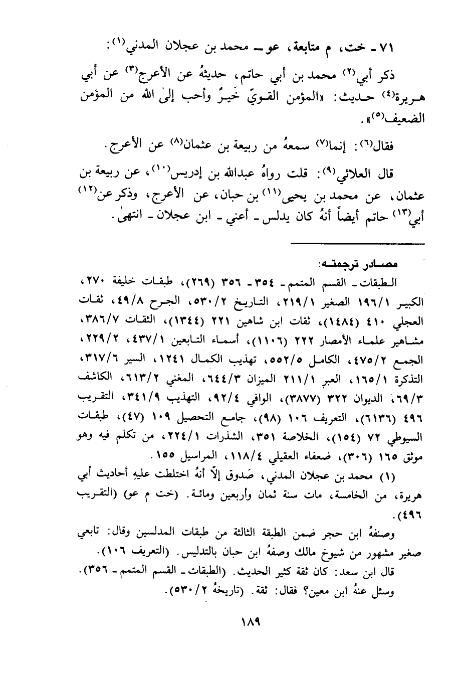 71 - خت م متابعة عو محمد بن عجلان المدني ذكر أبي محمد بن أبي حاتم حديثه عن الأعرج عن أبي هريرة حديث المؤمن القوي خير وأحب الى الله من المؤمن الضعيف فقال إنما سمعه من ربيعة بن عثمان عن الأعرج قال العلائي قلت رواه عبد الله بن إدريس عن ربيعة بن عثمان عن محمد بن يحيى بن حبان عن الأعرج وذكر عن أبي حاتم أيضا انه كان يدلس اعني بن عجلان انتهى