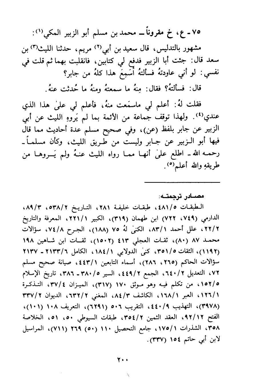 75 - ع خ مقرونا محمد بن مسلم أبو الزبير المكي مشهور بالتدليس قال سعيد بن أبي مريم حدثنا الليث بن سه قال جئت أبا الزبير فدفع لي كتابين فانقلبت بهما ثم قلت في نفس لو اني عاودته فسألته اسمع هذا كله من جابر قال فسألته فقال منه ما سمعته ومنه ما حدثت عنه فقلت له ك اعلم لي ما سمعت منه فاعلم لي على هذا الذي عندي ولهذا توقف جماعة من الأئمة بما لم يروه الليث عن أبي الزبير عن جابر بلفظ عن وفي صحيح مسلم عدة أحاديث مما قال فيها أبو الزبير عن جابر وليست من طريق الليث وكأن مسلما رحمه الله اطلع على انها مما رواه الليث عنه ولم يروها من طريقه والله اعلم