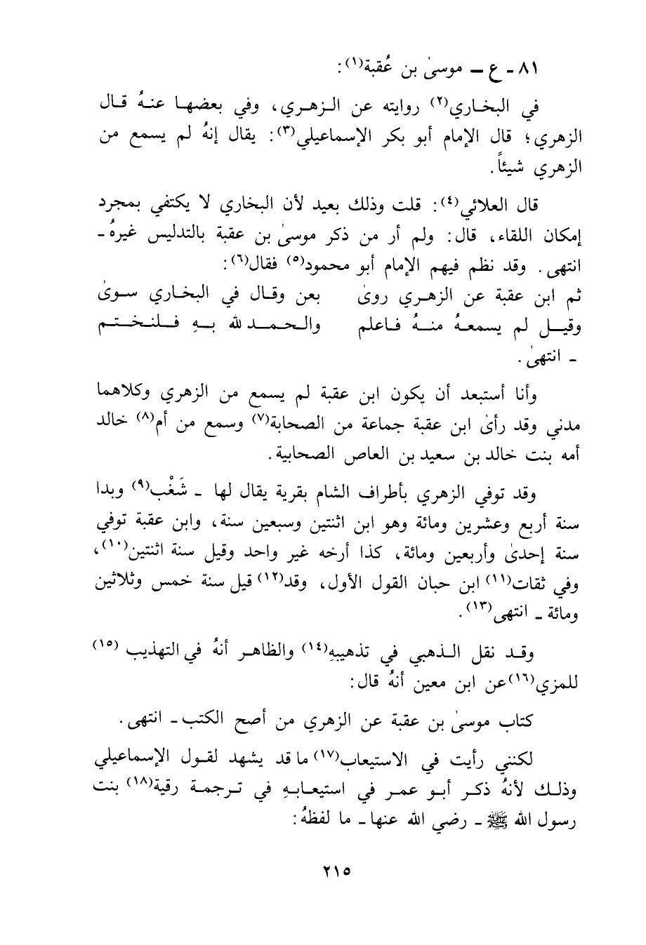81 - ع موسى بن عقبة في البخاري روايته عن الزهري وفي بعضها عنه قال الزهري قال الامام أبو بكر الإسماعيلي يقال انه لم يسمع من الزهري شيئا قال العلائي قلت وذلك بعيد لان البخاري لا يكتفي بمجرد إمكان اللقاء قال ولم ار من ذكر موسى بن عقبة بالتدليس غيره انتهى وقد نظم فيهم الامام أبو محمود فقال ثم بن عقبة عن الزهري روى بعن وقال في البخاري سوى وقيل لم يسمعه منه فاعلم والحمد لله به فلنختم انتهى وانا استبعد ان يكون بن عقبة لم يسمع من الزهري وكلاهما مدني وقد رأى بن عقبة جماعة من الصحابة وسمع من أم خالد أمه بنت خالد بن سعيد بن العاص الصحابية وقد توفي الزهري بأطراف الشام بقرية يقال لها شغب وبدا سنة أربع وعشرين ومائة وهو بن اثنتين وسبعين سنة وابن عقبة توفي سنة إحدى وأربعين ومائة كذا أرخه غير واحد وقيل سنة اثنتين وفي ثقات بن حبان القول الأول وقد قيل سنة خمس وثلاثين ومائه انتهى وقد نقل الذهبي في تذهيبه والظاهر انه في التهذيب للمزي عن بن معين انه قال كتاب موسى بن عقبة عن الزهري من أصح الكتب انتهى لكنني رأيت في الاستيعاب ما قد يشهد لقول الإسماعيلي وذلك لأنه ذكر أبو عمر في استيعابه في ترجمة رقية بنت رسول الله صلى الله عليه و سلم رضي الله عنها ما لفظه