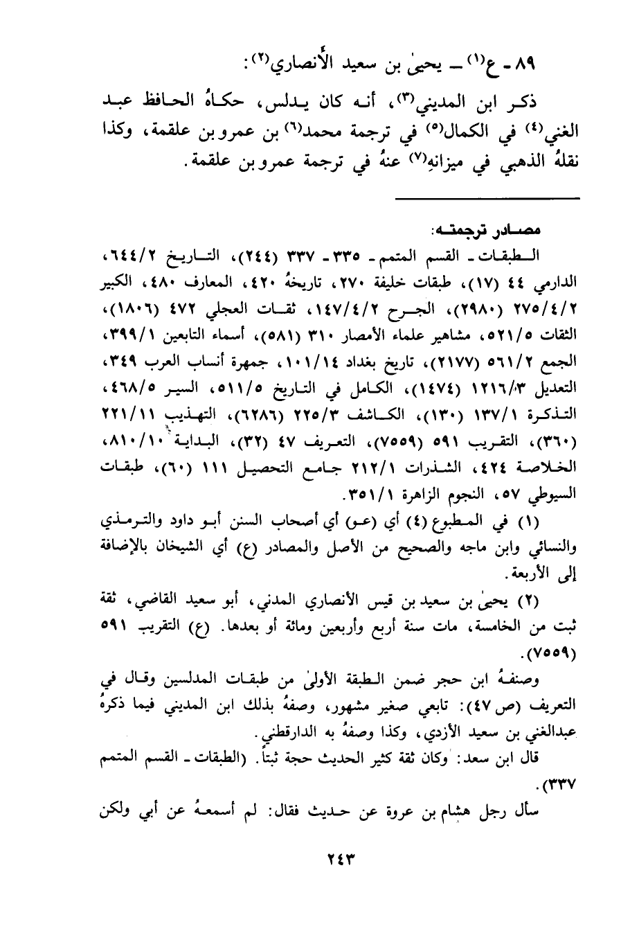 89 - ع يحيى بن سعيد الأنصاري ذكر بن المدين انه كان يدلس حكاه الحافظ عبد الغني في الكمال في ترجمة محمد بن عمرو بن علقمة وكذا نقله الذهبي في ميزانه عنه في ترجمة عمرو بن علقمة