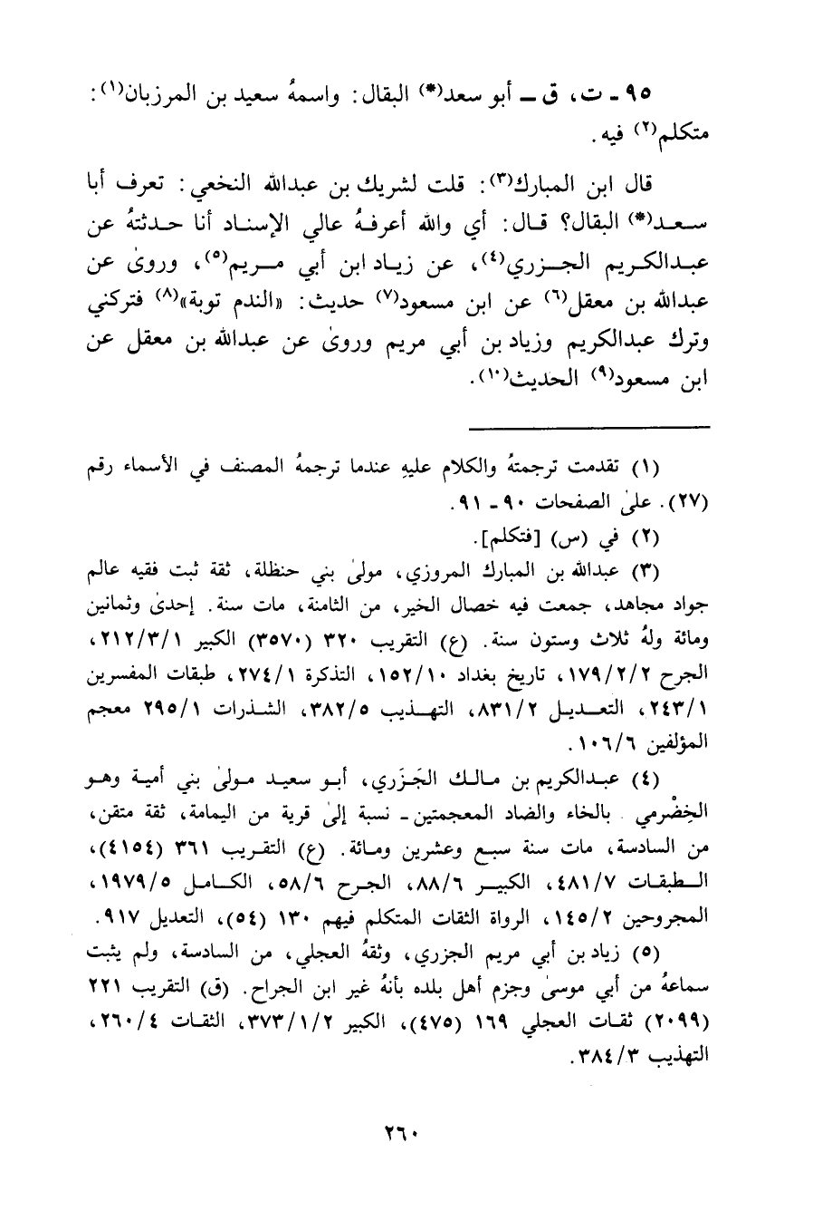 95 - ت ق أبو سعد البقال واسمه سعيد بن المرزبان متكلم فيه قال بن المبارك قلت لشريك بن عبد الله النخعي تعرف أبا سعد البقال قال أي والله اعرفه عالي الإسناد انا حدثته عن عبد الكريم الجزري عن زياد بن أبي مريم وروى عن عبد الله بن معقل عن بن مسعود حديث الندم توبة فتركني وترك عبد الكريم وزياد بن أبي مريم وروى عن عبد الله بن معقل عن بن مسعود الحديث