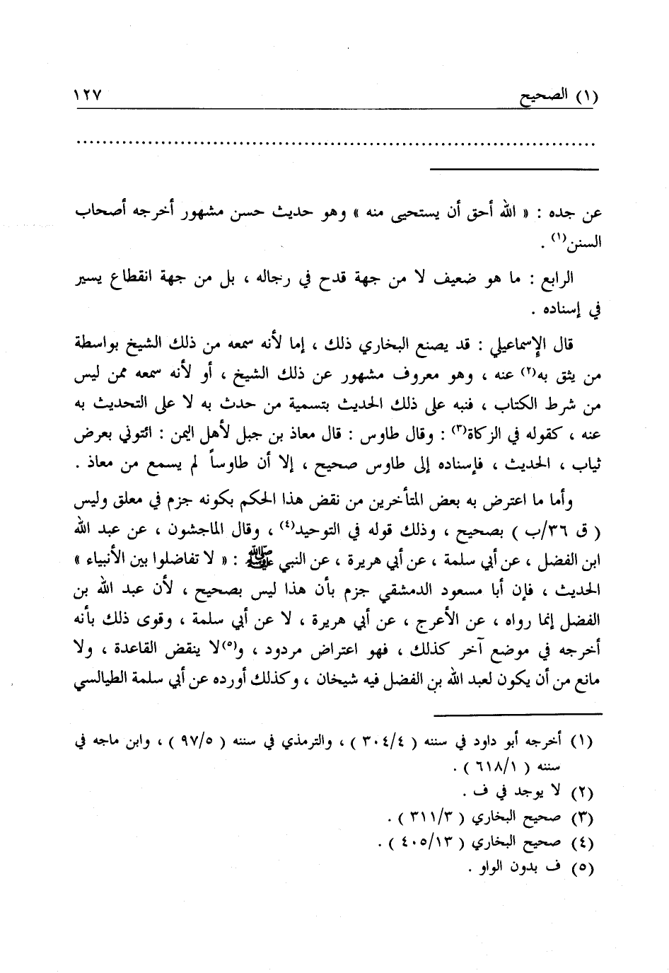 الرَّابِعُ: مَا هُوَ ضَعِيفٌ لَا مِنْ جِهَةِ قَدْحٍ فِي رِجَالِهِ، بَلْ مِنْ جِهَةِ انْقِطَاعٍ يَسِيرٍ فِي إِسْنَادِهِ، قَالَ الْإِسْمَاعِيلِيُّ: قَدْ يَصْنَعُ الْبُخَارِيُّ ذَلِكَ إِمَّا لِأَنَّهُ سَمِعَهُ مِنْ ذَلِكَ الشَّيْخِ بِوَاسِطَةِ مَنْ يَثِقُ بِهِ عَنْهُ، وَهُوَ مَعْرُوفٌ مَشْهُورٌ عَنْ ذَلِكَ الشَّيْخِ، أَوْ لِأَنَّهُ سَمِعَهُ مِمَّنْ لَيْسَ مِنْ شَرْطِ الْكِتَابِ، فَنَبَّهَ عَلَى ذَلِكَ الْحَدِيثِ بِتَسْمِيَةِ مَنْ حَدَّثَ بِهِ لَا عَلَى التَّحْدِيثِ بِهِ عَنْهُ، كَقَوْلِهِ فِي الزَّكَاةِ: وَقَالَ طَاوُسٌ: قَالَ مُعَاذُ بْنُ جَبَلٍ لِأَهْلِ الْيَمَنِ: ائْتُونِي بِعَرْضِ ثِيَابٍ، الْحَدِيثَ، فَإِسْنَادُهُ إِلَى طَاوُسٍ صَحِيحٌ، إِلَّا أَنَّ طَاوُسًا لَمْ يَسْمَعْ مِنْ مُعَاذٍ.
