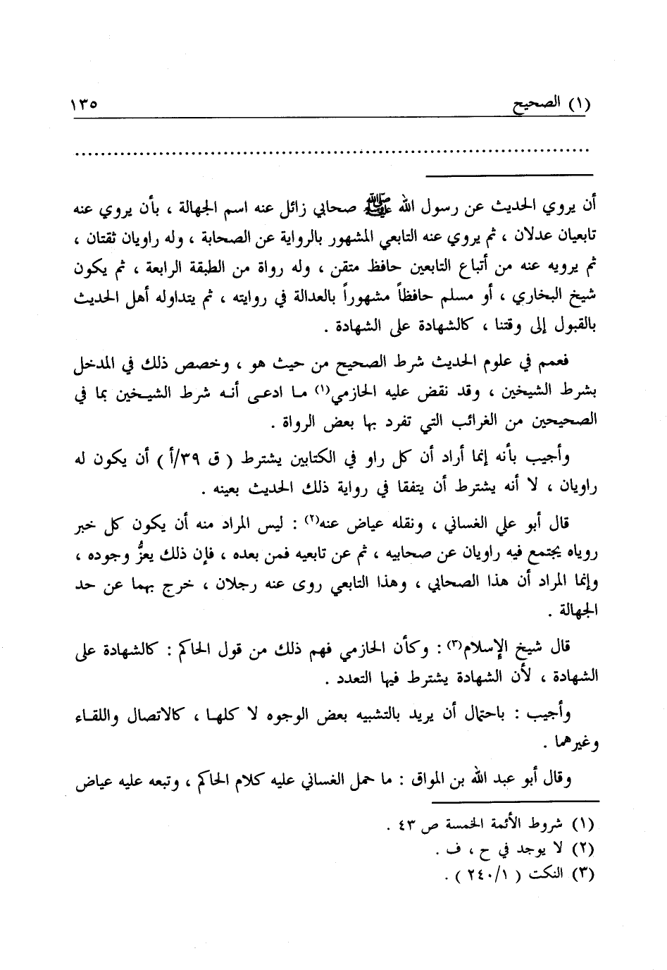 فَعَمَّمَ فِي عُلُومِ الْحَدِيثِ شَرْطَ الصَّحِيحِ مِنْ حَيْثُ هُوَ، وَخَصَّصَ ذَلِكَ فِي الْمَدْخَلِ بِشَرْطِ الشَّيْخَيْنِ، وَقَدْ نَقَضَ عَلَيْهِ الْحَازِمِيُّ مَا ادَّعَى أَنَّهُ شَرْطُ الشَّيْخَيْنِ بِمَا فِي الصَّحِيحَيْنِ مِنَ الْغَرَائِبِ الَّتِي تَفَرَّدَ بِهَا بَعْضُ الرُّوَاةِ.
