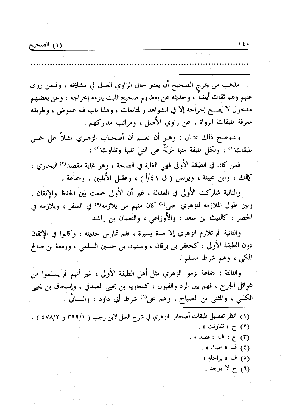 وَلْنُوَضِّحْ ذَلِكَ بِمِثَالٍ: وَهُوَ أَنْ تَعْلَمَ أَنَّ أَصْحَابَ الزُّهْرِيِّ مَثَلًا عَلَى خَمْسِ طَبَقَاتٍ وَلِكُلِّ طَبَقَةٍ مِنْهَا مَزِيَّةٌ عَلَى الَّتِي تَلِيهَا وَتَفَاوُتٌ: فَمَنْ كَانَ فِي الطَّبَقَةِ الْأُولَى فَهِيَ الْغَايَةُ فِي الصِّحَّةِ، وَهُوَ غَايَةُ مَقْصِدِ الْبُخَارِيِّ، كَمَالِكٍ وَابْنِ عُيَيْنَةَ، وَيُونُسَ وَعُقَيْلٍ الْأَيْلِيَّيْنِ وَجَمَاعَةٍ.