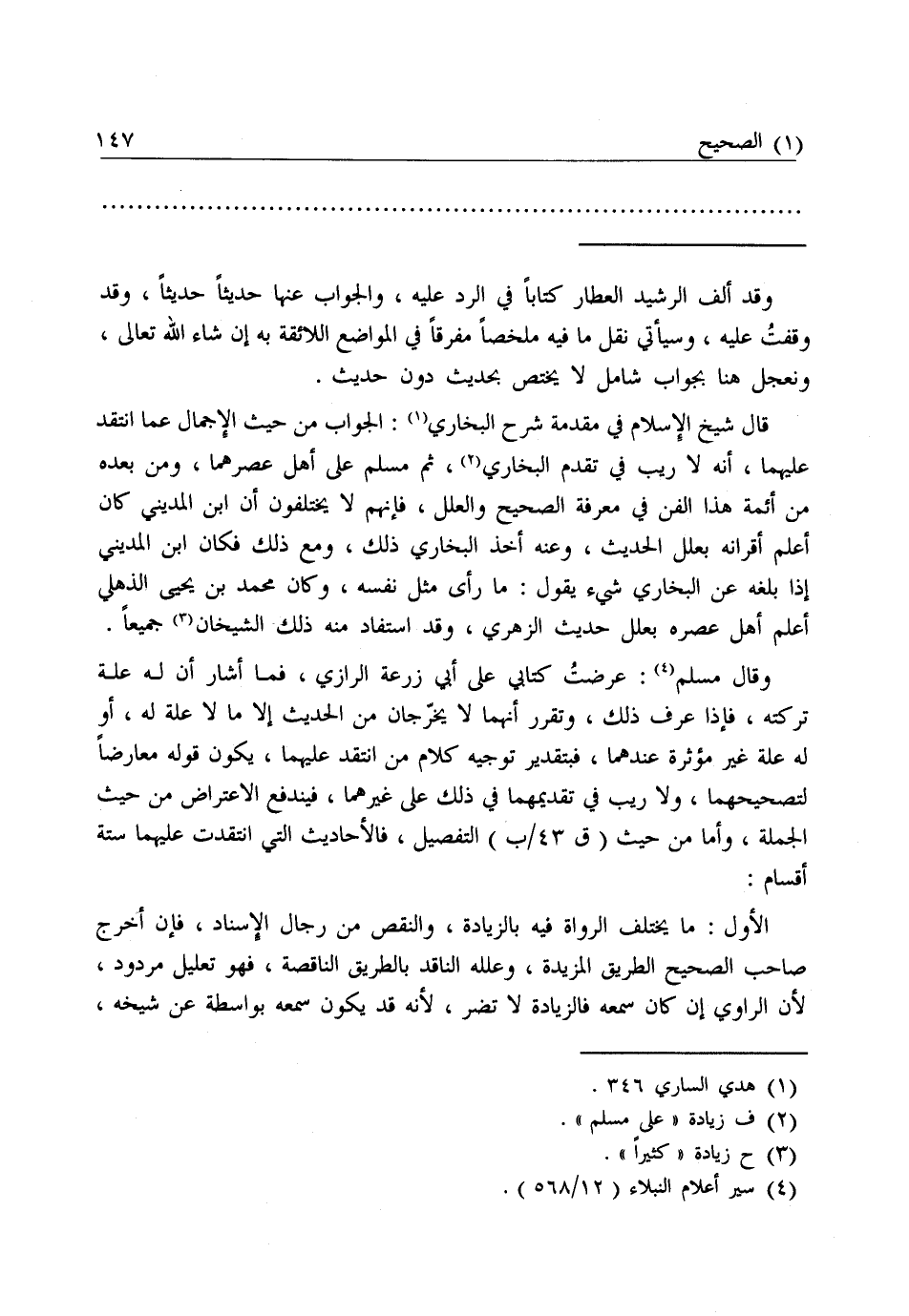 وَأَمَّا مِنْ حَيْثُ التَّفْصِيلُ فَالْأَحَادِيثُ الَّتِي انْتُقِدَتْ عَلَيْهِمَا سِتَّةُ أَقْسَامٍ: الْأَوَّلُ: مَا يَخْتَلِفُ الرُّوَاةُ فِيهِ بِالزِّيَادَةِ وَالنَّقْصِ مِنْ رِجَالِ الْإِسْنَادِ، فَإِنْ أَخْرَجَ صَاحِبُ الصَّحِيحِ الطَّرِيقَ الْمَزِيدَةَ، وَعَلَّلَهُ النَّاقِدُ بِالطَّرِيقِ النَّاقِصَةِ فَهُوَ تَعْلِيلٌ مَرْدُودٌ؛ لِأَنَّ الرَّاوِيَ إِنْ كَانَ سَمِعَهُ فَالزِّيَادَةُ لَا تَضُرُّ؛ لِأَنَّهُ قَدْ يَكُونُ سَمِعَهُ بِوَاسِطَةٍ عَنْ شَيْخِهِ