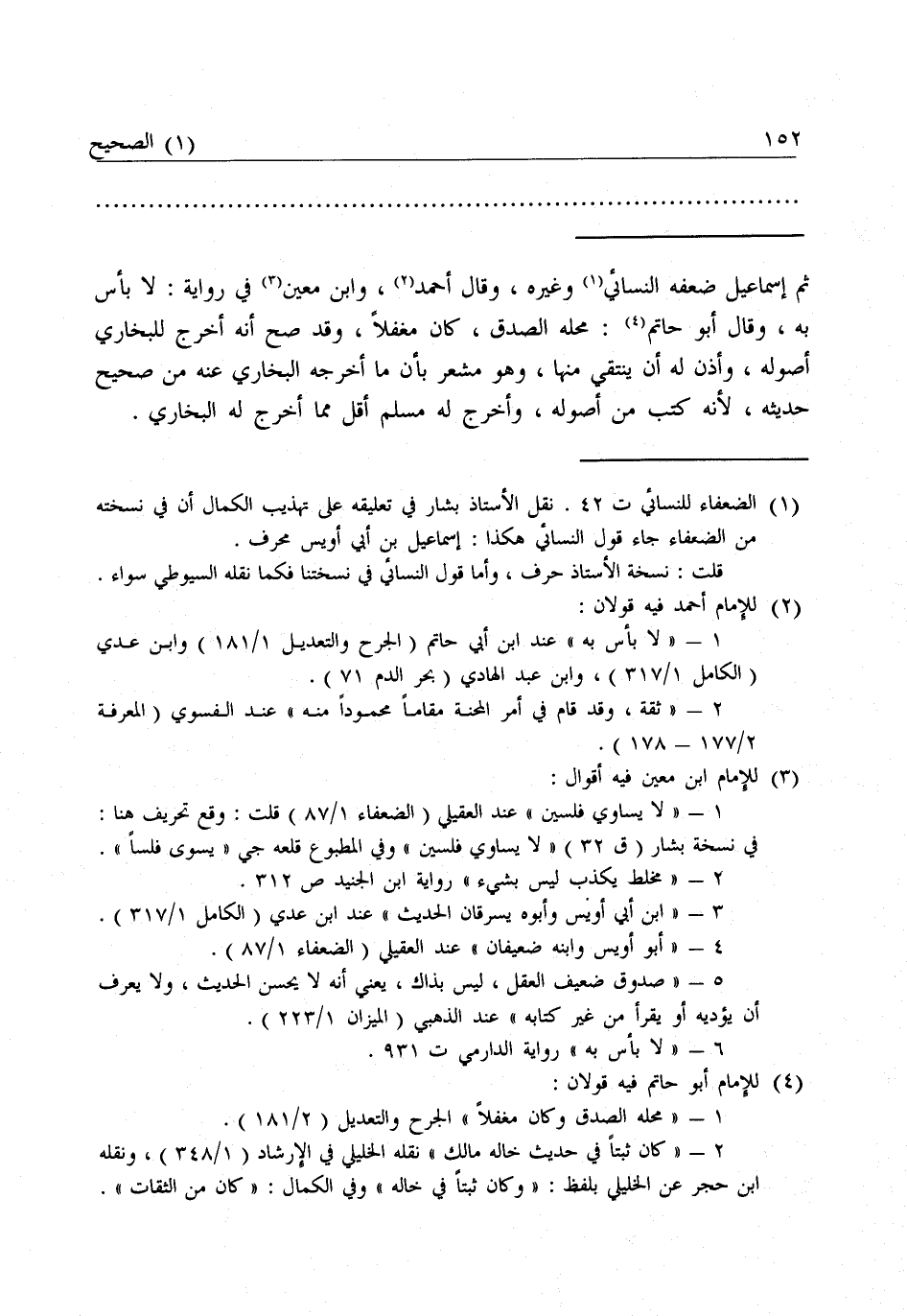 ـــــــــــــــــــــــــــــQثُمَّ إِنَّ إِسْمَاعِيلَ ضَعَفَّهُ النَّسَائِيُّ وَغَيْرُهُ، وَقَالَ أَحْمَدُ وَابْنُ مَعِينٍ فِي رِوَايَةٍ: لَا بَأْسَ بِهِ، وَقَالَ أَبُو حَاتِمٍ: مَحَلُّهُ الصِّدْقُ، كَانَ مُغَفَّلًا. وَقَدْ صَحَّ أَنَّهُ أَخْرَجَ لِلْبُخَارِيِّ أُصُولَهُ، وَأَذِنَ لَهُ أَنْ يَنْتَقِيَ مِنْهَا، وَهُوَ مُشْعِرٌ بِأَنَّ مَا أَخْرَجَهُ الْبُخَارِيُّ عَنْهُ مِنْ صَحِيحِ حَدِيثِهِ؛ لِأَنَّهُ كَتَبَ مِنْ أُصُولِهِ، وَأَخْرَجَ لَهُ مُسْلِمٌ أَقَلَّ مِمَّا أَخْرَجَ لَهُ الْبُخَارِيُّ.