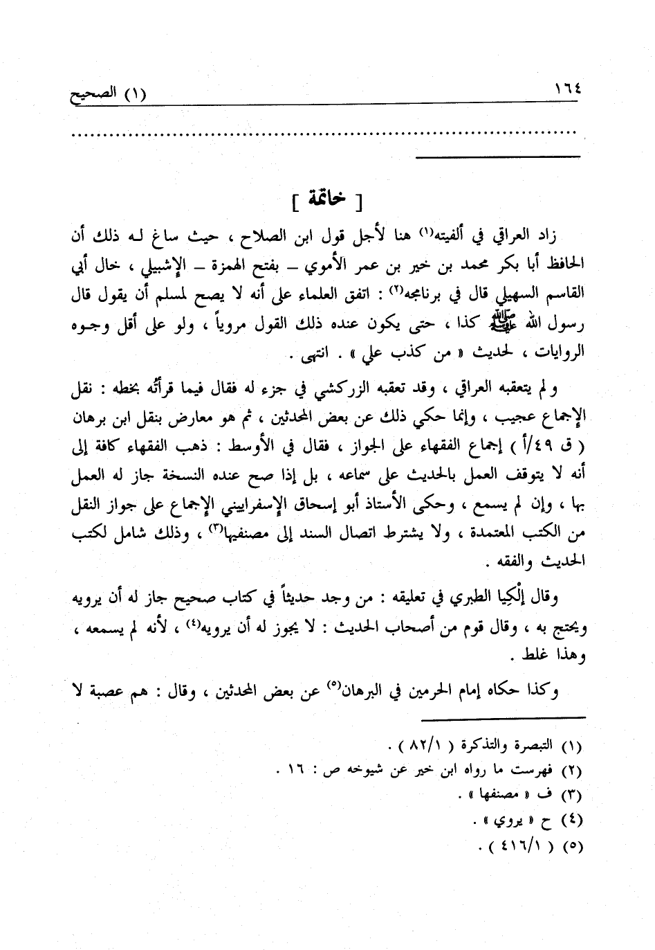 وَلَمْ يَتَعَقَّبْهُ الْعِرَاقِيُّ، وَقَدْ تَعَقَّبَهُ الزَّرْكَشِيُّ فِي جُزْءٍ لَهُ فَقَالَ فِيمَا قَرَأْتُهُ بِخَطِّهِ: نَقْلُ الْإِجْمَاعِ عَجِيبٌ، وَإِنَّمَا حُكِيَ ذَلِكَ عَنْ بَعْضِ الْمُحَدِّثِينَ، ثُمَّ هُوَ مُعَارَضٌ بِنَقْلِ ابْنِ بُرْهَانَ إِجْمَاعَ الْفُقَهَاءِ عَلَى الْجَوَازِ، فَقَالَ فِي الْأَوْسَطِ: ذَهَبَ الْفُقَهَاءُ كَافَّةً إِلَى أَنَّهُ لَا يَتَوَقَّفُ الْعَمَلُ بِالْحَدِيثِ عَلَى سَمَاعِهِ، بَلْ إِذَا صَحَّ عِنْدَهُ النُّسْخَةُ جَازَ لَهُ الْعَمَلُ بِهَا، وَإِنْ لَمْ يَسْمَعْ، وَحَكَى الْأُسْتَاذُ أَبُو إِسْحَاقَ الْإِسْفَرَايِينِيُّ الْإِجْمَاعَ عَلَى جَوَازِ النَّقْلِ مِنَ الْكُتُبِ الْمُعْتَمَدَةِ، وَلَا يُشْتَرَطُ اتِّصَالُ السَّنَدِ إِلَى مُصَنِّفِيهَا، وَذَلِكَ شَامِلٌ لِكُتُبِ الْحَدِيثِ وَالْفِقْهِ.