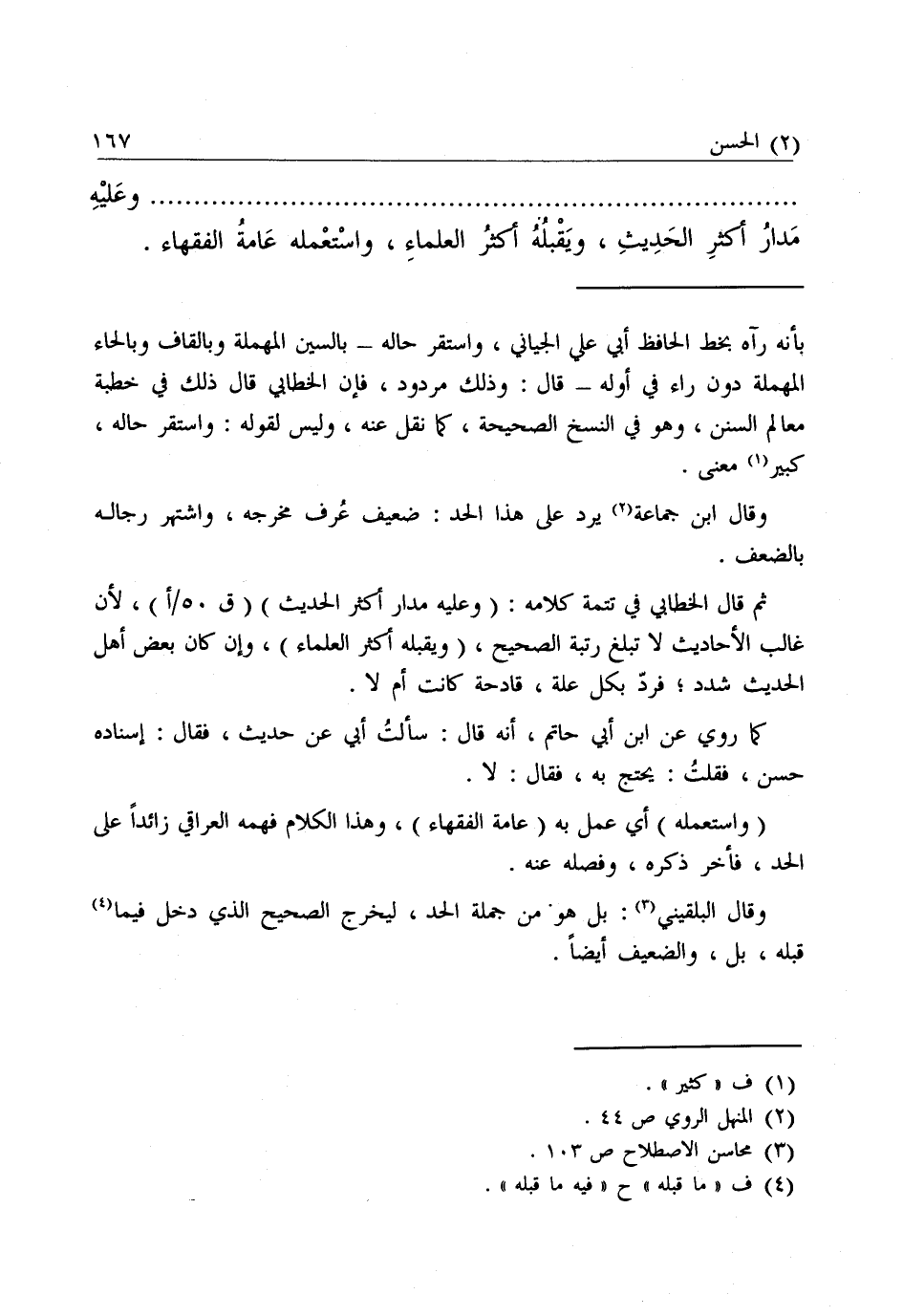 ثُمَّ قَالَ الْخَطَّابِيُّ فِي تَتِمَّةِ كَلَامِهِ: (وَعَلَيْهِ مَدَارُ أَكْثَرِ الْحَدِيثِ) لِأَنَّ غَالِبَ الْأَحَادِيثِ لَا تَبْلُغُ رُتْبَةَ الصَّحِيحِ (وَيَقْبَلُهُ أَكْثَرُ الْعُلَمَاءِ) ، وَإِنْ كَانَ بَعْضُ أَهْلِ الْحَدِيثِ شَدَّدَ، فَرَدَّ بِكُلِّ عِلَّةٍ، قَادِحَةٍ كَانَتْ أَمْ لَا.