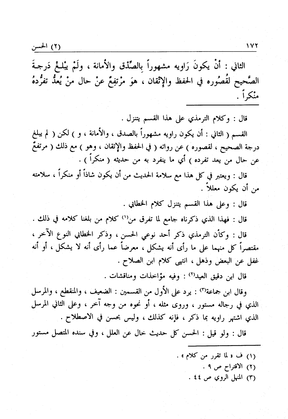 قَالَ: وَيُعْتَبَرُ فِي كُلِّ هَذَا مَعَ سَلَامَةِ الْحَدِيثِ مِنْ أَنْ يَكُونَ شَاذًّا أَوْ مُنْكَرًا، سَلَامَتُهُ مِنْ أَنْ يَكُونَ مُعَلَّلًا. قَالَ: وَعَلَى هَذَا الْقِسْمِ يَتَنَزَّلُ كَلَامُ الْخَطَّابِيِّ.