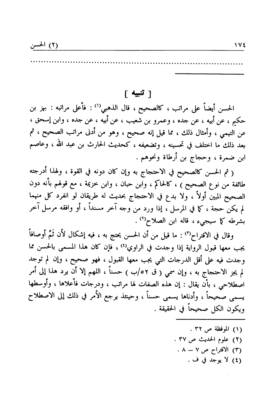 وَقَالَ فِي الِاقْتِرَاحِ: مَا قِيلَ مِنْ أَنَّ الْحَسَنَ يُحْتَجُّ بِهِ، فِيهِ إِشْكَالٌ لِأَنَّ ثَمَّ أَوْصَافًا يَجِبُ مَعَهَا قَبُولُ الرِّوَايَةِ إِذَا وُجِدَتْ فِي الرَّاوِي، فَإِنْ كَانَ هَذَا الْمُسَمَّى بِالْحَسَنِ مِمَّا وُجِدَتْ فِيهِ عَلَى أَقَلِّ الدَّرَجَاتِ الَّتِي يَجِبُ مَعَهَا الْقَبُولُ فَهُوَ صَحِيحٌ، وَإِنْ لَمْ تُوجَدْ لَمْ يَجُزِ الِاحْتِجَاجُ بِهِ وَإِنْ سُمِّيَ حَسَنًا، اللَّهُمَّ إِلَّا أَنْ يُرَدَّ هَذَا إِلَى أَمْرٍ اصْطِلَاحِيٍّ، بِأَنْ يُقَالَ إِنَّ هَذِهِ الصِّفَاتِ لَهَا مَرَاتِبُ وَدَرَجَاتٌ فَأَعْلَاهَا وَأَوْسَطُهَا يُسَمَّى صَحِيحًا، وَأَدْنَاهَا يُسَمَّى حَسَنًا، وَحِينَئِذٍ رَجَعَ الْأَمْرُ فِي ذَلِكَ إِلَى الِاصْطِلَاحِ وَيَكُونُ الْكُلُّ صَحِيحًا فِي الْحَقِيقَةِ.