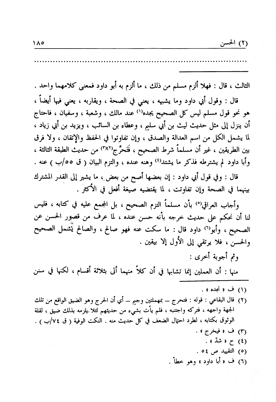 قَالَ: وَفِي قَوْلِ أَبِي دَاوُدَ: إِنَّ بَعْضَهَا أَصَحُّ مِنْ بَعْضٍ. مَا يُشِيرُ إِلَى الْقَدْرِ الْمُشْتَرَكِ بَيْنَهُمَا فِي الصِّحَّةِ وَإِنْ تَفَاوَتَتْ، لِمَا يَقْتَضِيهِ صِيغَةُ أَفْعَلَ فِي الْأَكْثَرِ، وَأَجَابَ الْعِرَاقِيُّ بِأَنَّ مُسْلِمًا الْتَزَمَ الصَّحِيحَ، بَلِ الْمُجْمَعَ عَلَيْهِ فِي كِتَابِهِ، فَلَيْسَ لَنَا أَنْ نَحْكُمَ عَلَى حَدِيثٍ خَرَّجَهُ بِأَنَّهُ حَسَنٌ عِنْدَهُ، لِمَا عُرِفَ مِنْ قُصُورِ الْحَسَنِ عَنِ الصَّحِيحِ، وَأَبُو دَاوُدَ قَالَ: مَا سَكَتَ عَنْهُ فَهُوَ صَالِحٌ، وَالصَّالِحُ يَشْمَلُ الصَّحِيحَ وَالْحَسَنَ، فَلَا يَرْتَقِي إِلَى الْأَوَّلِ إِلَّا بِيَقِينٍ.