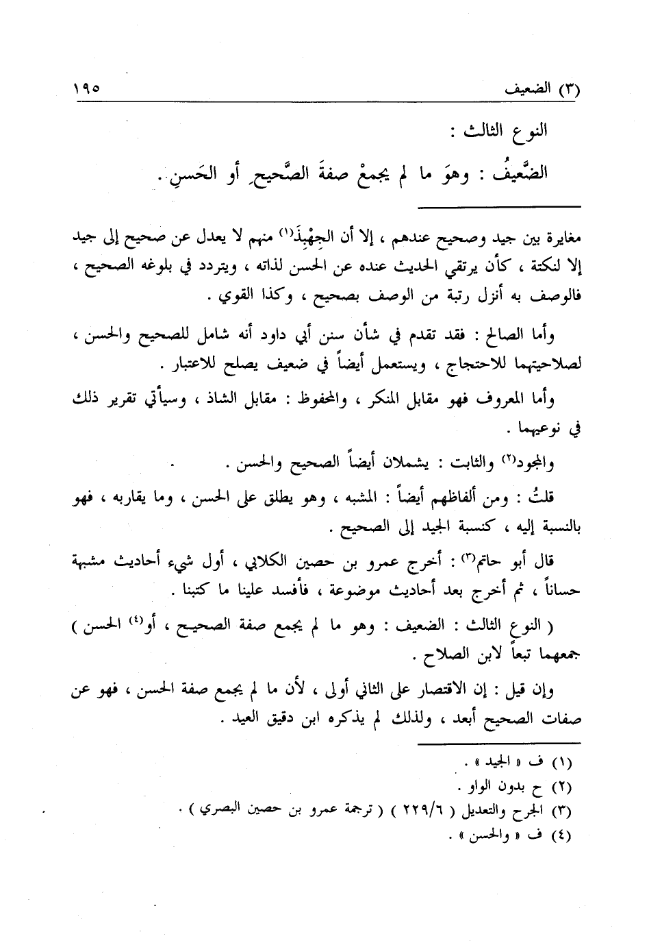(النَّوْعُ الثَّالِثُ: الضَّعِيفُ: وَهُوَ مَا لَمْ يَجْمَعْ صِفَةَ الصَّحِيحِ أَوِ الْحَسَنِ) جَمَعَهُمَا تَبَعًا لِابْنِ الصَّلَاحِ.