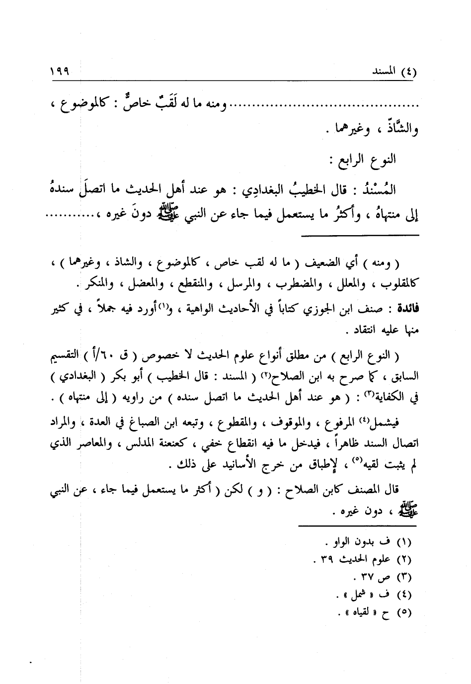 (النَّوْعُ الرَّابِعُ) مِنْ مُطْلَقِ أَنْوَاعِ عُلُومِ الْحَدِيثِ لَا خُصُوصِ (ق 60 \ أ) التَّقْسِيمِ السَّابِقِ، كَمَا صَرَّحَ بِهِ ابْنُ الصَّلَاحِ (الْمُسْنَدُ، قَالَ الْخَطِيبُ) أَبُو بَكْرٍ (الْبَغْدَادِيُّ) فِي " الْكِفَايَةِ ": (هُوَ عِنْدَ أَهْلِ الْحَدِيثِ مَا اتَّصَلَ سَنَدُهُ) مِنْ رَاوِيهِ (إِلَى مُنْتَهَاهُ)