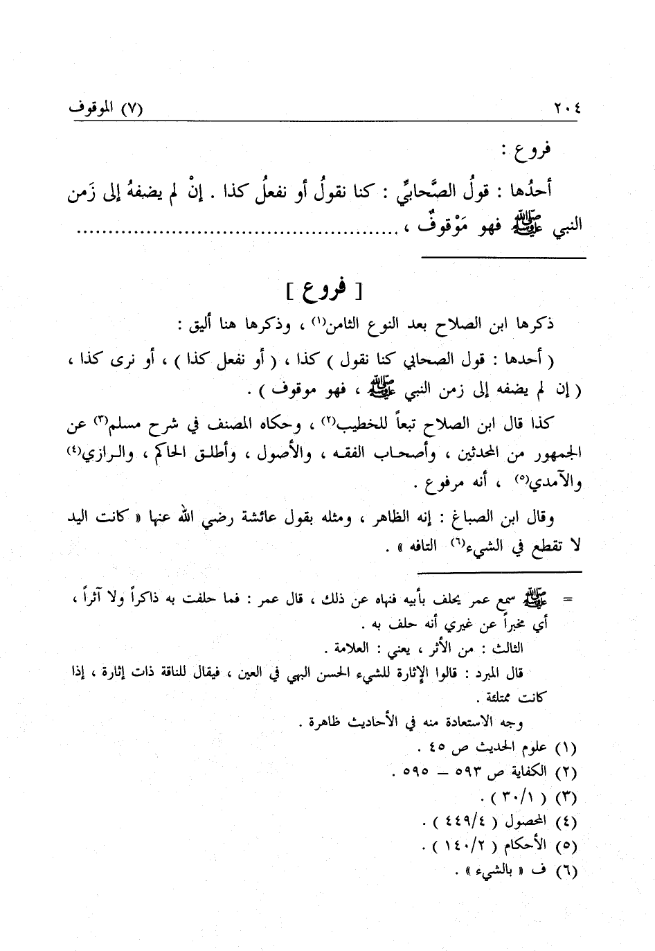 ذَكَرَهَا ابْنُ الصَّلَاحِ بَعْدَ النَّوْعِ الثَّامِنِ، وَذِكْرُهَا هُنَا أَلْيَقُ. (أَحَدُهَا: قَوْلُ الصَّحَابِيِّ كُنَّا نَقُولُ) كَذَا، (أَوْ نَفْعَلُ كَذَا) ، أَوْ نَرَى كَذَا، (إِنْ لَمْ يُضِفْهُ إِلَى زَمَنِ النَّبِيِّ - صَلَّى اللَّهُ عَلَيْهِ وَسَلَّمَ - فَهُوَ مَوْقُوفٌ) .