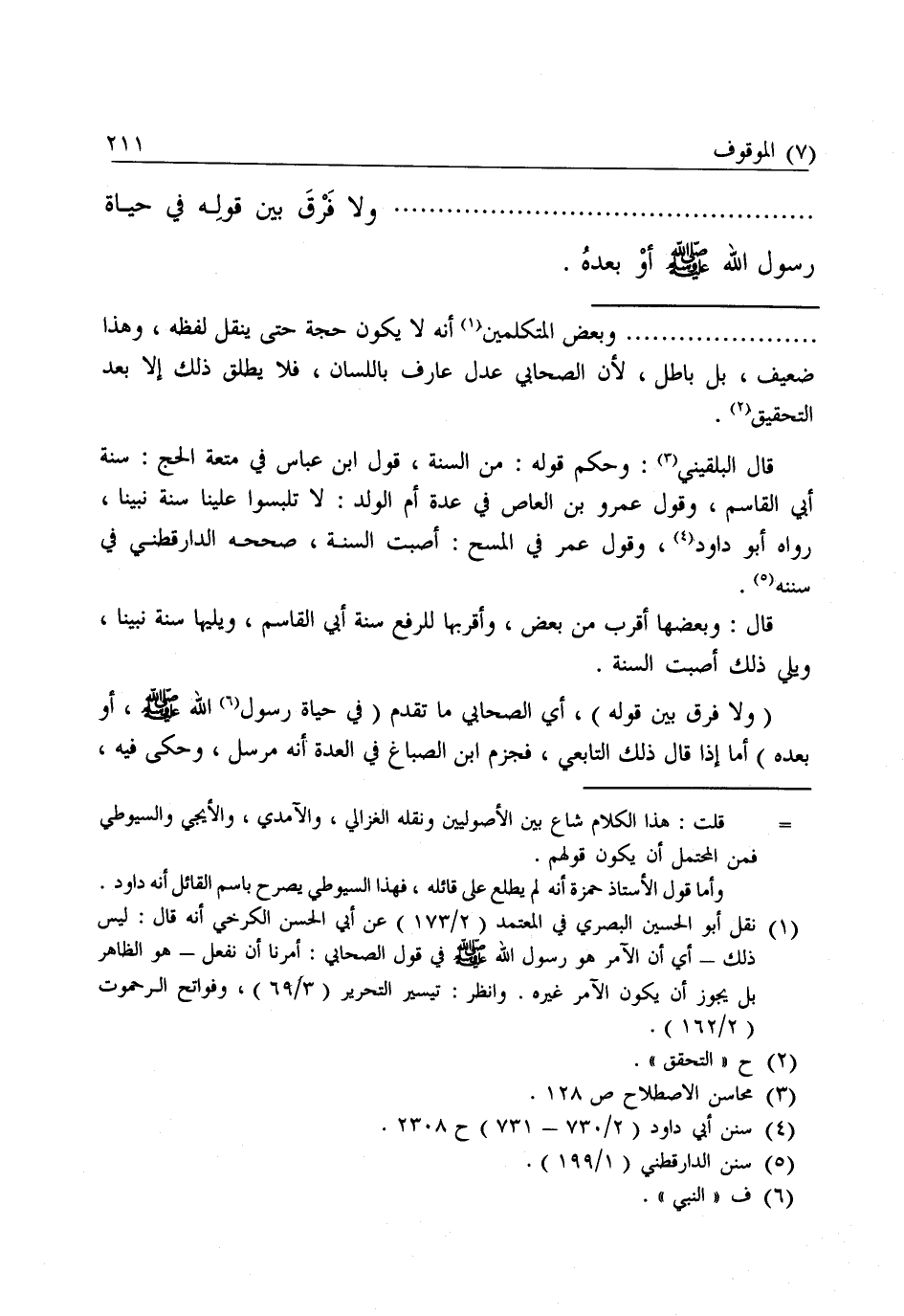 قَالَ الْبُلْقِينِيُّ: وَحُكْمُ قَوْلِهِ: مِنَ السُّنَّةِ، قَوْلُ ابْنِ عَبَّاسٍ فِي مُتْعَةِ الْحَجِّ: سُنَّةُ أَبِي الْقَاسِمِ، وَقَوْلُ عَمْرِو بْنِ الْعَاصِ فِي عِدَّةِ أُمِّ الْوَلَدِ: لَا تُلَبِّسُوا عَلَيْنَا سُنَّةَ نَبِيِّنَا، رَوَاهُ أَبُو دَاوُدَ، وَقَوْلُ عُمَرَ فِي الْمَسْحِ: أَصَبْتَ السُّنَّةَ، صَحَّحَهُ الدَّارَقُطْنِيُّ فِي سُنَنِهِ.