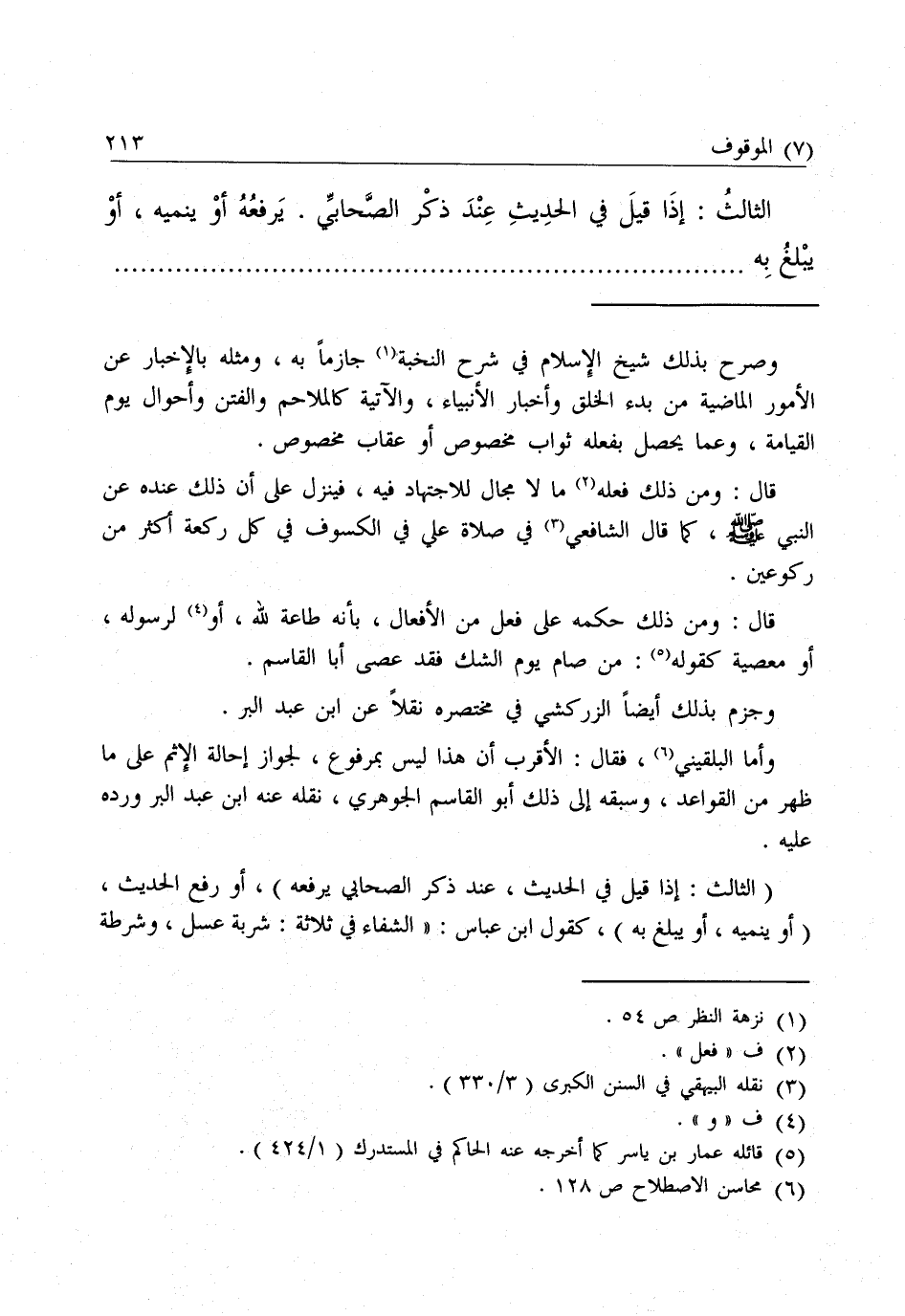 ـــــــــــــــــــــــــــــQوَصَرَّحَ بِذَلِكَ شَيْخُ الْإِسْلَامِ فِي " شَرْحِ النُّخْبَةِ " جَازِمًا بِهِ، وَمَثَّلَهُ بِالْإِخْبَارِ عَنِ الْأُمُورِ الْمَاضِيَةِ مِنْ بَدْءِ الْخَلْقِ، وَأَخْبَارِ الْأَنْبِيَاءِ، وَالْآتِيَةِ كَالْمَلَاحِمِ وَالْفِتَنِ وَأَحْوَالِ يَوْمِ الْقِيَامَةِ، وَعَمَّا يَحْصُلُ بِفِعْلِهِ ثَوَابٌ مَخْصُوصٌ أَوْ عِقَابٌ مَخْصُوصٌ.