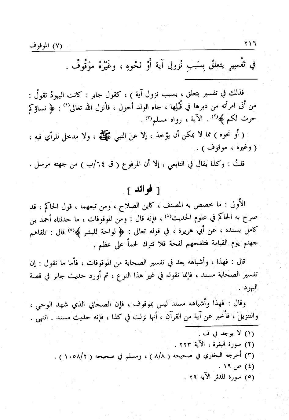 قَالَ فَهَذَا وَأَشْبَاهُهُ يُعَدُّ فِي تَفْسِيرِ الصَّحَابَةِ مِنَ الْمَوْقُوفَاتِ، فَأَمَّا مَا نَقُولُ: إِنَّ تَفْسِيرَ الصَّحَابَةِ مُسْنَدٌ، فَإِنَّمَا نَقُولُهُ فِي غَيْرِ هَذَا النَّوْعِ، ثُمَّ أَوْرَدَ حَدِيثَ جَابِرٍ فِي قِصَّةِ الْيَهُودِ.