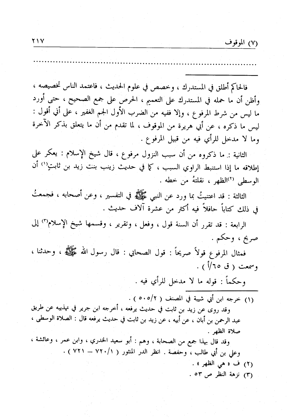 ـــــــــــــــــــــــــــــQفَالْحَاكِمُ أَطْلَقَ فِي " الْمُسْتَدْرَكِ "، وَخَصَّصَ فِي عُلُومِ الْحَدِيثِ، فَاعْتَمَدَ النَّاسُ تَخْصِيصَهُ، وَأَظُنُّ أَنَّ مَا حَمَلَهُ فِي " الْمُسْتَدْرَكِ " عَلَى التَّعْمِيمِ، الْحِرْصُ عَلَى جَمْعِ الصَّحِيحِ، حَتَّى أَوْرَدَ مَا لَيْسَ مِنْ شَرْطِ الْمَرْفُوعِ، وَإِلَّا فَفِيهِ مِنَ الضَّرْبِ الْأَوَّلِ الْجَمُّ الْغَفِيرُ، عَلَى أَنِّي أَقُولُ: لَيْسَ مَا ذَكَرَهُ، عَنْ أَبِي هُرَيْرَةَ مِنَ الْمَوْقُوفِ، لِمَا تَقَدَّمَ مِنْ أَنَّ مَا يَتَعَلَّقُ بِذِكْرِ الْآخِرَةِ، وَمَا لَا مَدْخَلَ لِلرَّأْيِ فِيهِ مِنْ قَبِيلِ الْمَرْفُوعِ.