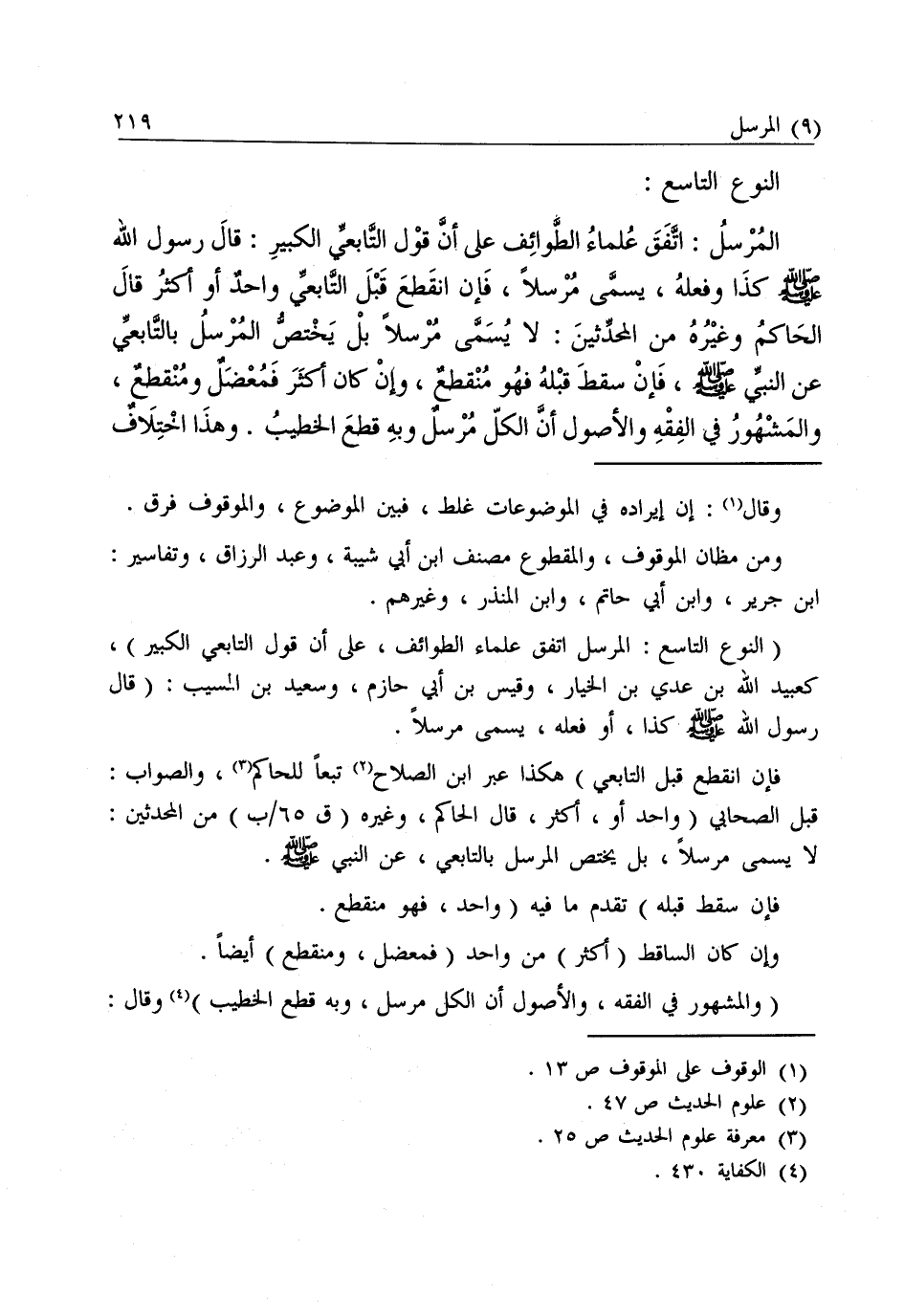 النَّوْعُ التَّاسِعُ: الْمُرْسَلُ: اتَّفَقَ عُلَمَاءُ الطَّوَائِفِ عَلَى أَنَّ قَوْلَ التَّابِعِيِّ الْكَبِيرِ قَالَ رَسُولُ اللَّهِ - صَلَّى اللَّهُ عَلَيْهِ وَسَلَّمَ - كَذَا وَفَعَلَهُ يُسَمَّى مُرْسَلًا، فَإِنِ انْقَطَعَ قَبْلَ التَّابِعِيِّ وَاحِدٌ أَوْ أَكْثَرُ قَالَ الْحَاكِمُ وَغَيْرُهُ مِنَ الْمُحَدِّثِينَ: لَا يُسَمَّى مُرْسَلًا بَلْ يَخْتَصُّ الْمُرْسَلُ بِالتَّابِعِيِّ عَنِ النَّبِيِّ - صَلَّى اللَّهُ عَلَيْهِ وَسَلَّمَ - فَإِنْ سَقَطَ قَبْلَهُ وَاحِدٌ فَهُوَ مُنْقَطِعٌ، وَإِنْ كَانَ أَكْثَرَ فَمُعْضَلٌ وَمُنْقَطِعٌ، وَالْمَشْهُورُ فِي الْفِقْهِ وَالْأُصُولِ، أَنَّ الْكُلَّ مُرْسَلٌ وَبِهِ قَطَعَ الْخَطِيبُ. وَهَذَا اخْتِلَافٌ فِي الِاصْطِلَاحِ وَالْعِبَارَةِ، وَأَمَّا قَوْلُ الزُّهْرِيِّ وَغَيْرِهِ مِنْ صِغَارِ التَّابِعِينَ: قَالَ النَّبِيُّ - صَلَّى اللَّهُ عَلَيْهِ وَسَلَّمَ - فَالْمَشْهُورُ عِنْدَ مَنْ خَصَّهُ بِالتَابِعِيِّ أَنَّهُ مُرْسَلٌ كَالْكَبِيرِ. وَقِيلَ: لَيْسَ بِمُرْسَلٍ بَلْ مُنْقَطِعٌ