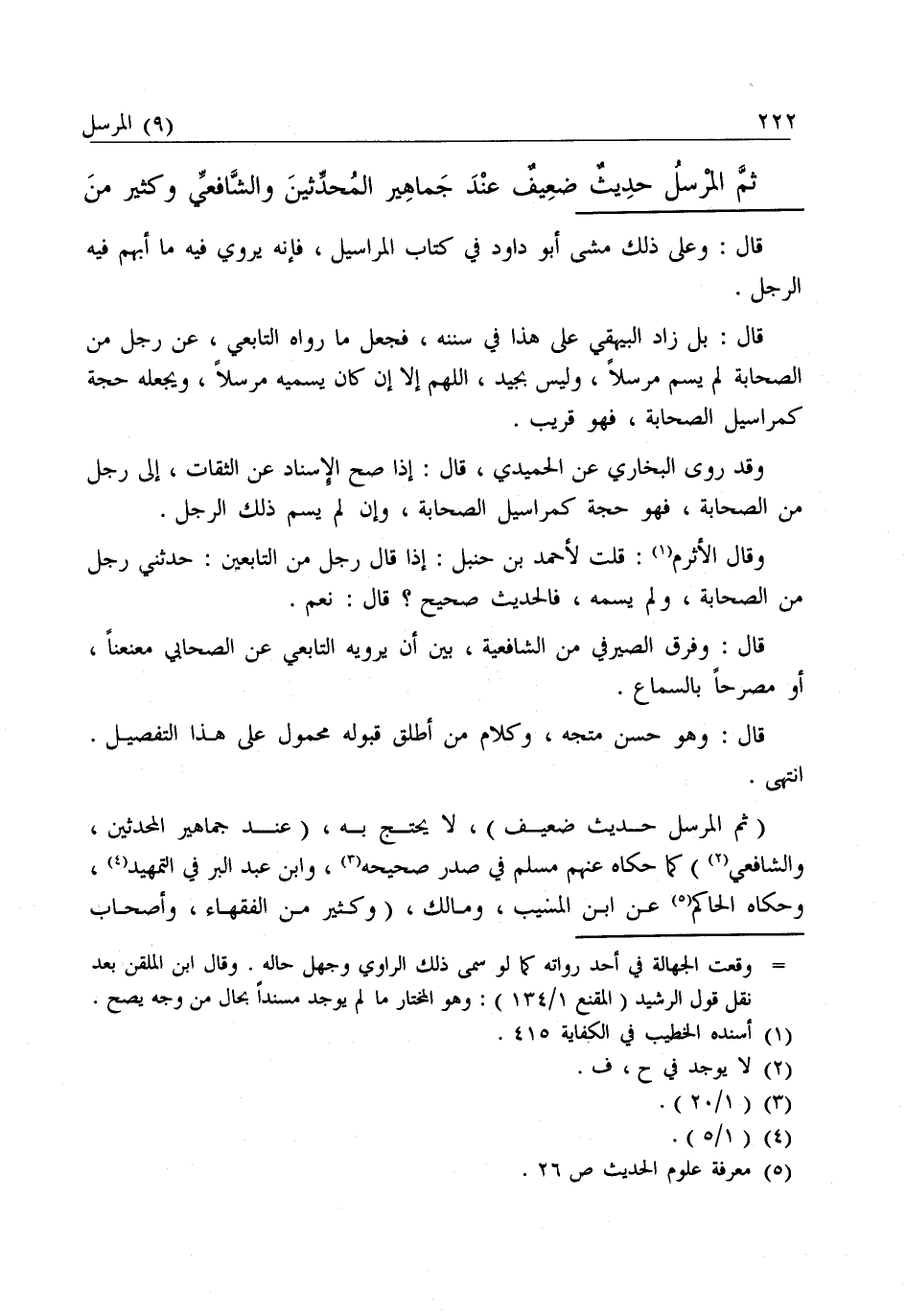 ثُمَّ الْمُرْسَلُ حَدِيثٌ ضَعِيفٌ عِنْدَ جَمَاهِيرِ الْمُحَدِّثِينَ وَالشَّافِعِيِّ وَكَثِيرٍ مِنَ الْفُقَهَاءِ وَأَصْحَابِ الْأُصُولِ. وَقَالَ مَالِكٌ، وَأَبُو حَنِيفَةَ فِي طَائِفَةٍ: صَحِيحٌ، فَإِنْ صَحَّ مُخْرَجُ الْمُرْسَلِ بِمَجِيئِهِ مِنْ وَجْهٍ آخَرَ مُسْنَدًا أَوْ مُرْسَلًا أَرْسَلَهُ مَنْ أَخَذَ عَنْ غَيْرِ رِجَالِ الْأَوَّلِ كَانَ صَحِيحًا، وَيَتَبَيَّنُ بِذَلِكَ صِحَّةُ الْمُرْسَلِ وَأَنَّهُمَا صَحِيحَانِ لَوْ عَارَضَهُمَا صَحِيحٌ مِنْ طَرِيقٍ رَجَّحْنَاهُمَا عَلَيْهِ إِذَا تَعَذَّرَ الْجَمْعُ، هَذَا كُلُّهُ فِي غَيْرِ مُرْسَلِ الصَّحَابِيِّ، أَمَّا مُرْسَلُهُ فَمَحْكُومٌ بِصِحَّتِهِ عَلَى الْمَذْهَبِ الصَّحِيحِ. وَقِيلَ: إِنَّهُ كَمُرْسَلِ غَيْرِهِ إِلَّا أَنْ يُبَيِّنَ الرِّوَايَةَ عَنْ صَحَابِيٍّ.