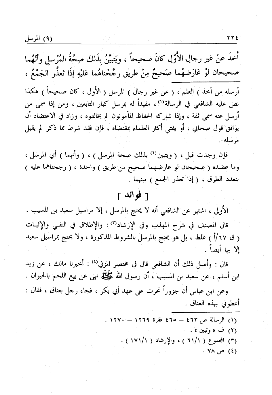 قَالَ الْمُصَنِّفُ فِي شَرْحِ الْمُهَذَّبِ، وَفِي الْإِرْشَادِ وَالْإِطْلَاقِ فِي النَّفْيِ وَالْإِثْبَاتِ (ق 67 \ أ) غَلَطٌ، بَلْ هُوَ يَحْتَجُّ بِالْمُرْسَلِ بِالشُّرُوطِ الْمَذْكُورَةِ، وَلَا يَحْتَجُّ بِمَرَاسِيلِ سَعِيدٍ إِلَّا بِهَا أَيْضًا.