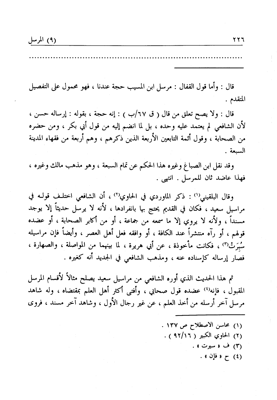 ثُمَّ هَذَا الْحَدِيثُ الَّذِي أَوْرَدَهُ الشَّافِعِيُّ مِنْ مَرَاسِيلِ سَعِيدٍ يَصْلُحُ مِثَالًا لِأَقْسَامِ الْمُرْسَلِ الْمَقْبُولِ، فَإِنَّهُ عَضَّدَهُ قَوْلُ صَحَابِيٍّ وَأَفْتَى أَكْثَرُ أَهْلِ الْعِلْمِ بِمُقْتَضَاهُ، وَلَهُ شَاهِدٌ مُرْسَلٌ آخَرُ أَرْسَلَهُ مَنْ أَخَذَ الْعِلْمَ مِنْ غَيْرِ رِجَالِ الْأَوَّلِ، وَشَاهِدٌ آخَرُ مُسْنَدٌ، فَرَوَى