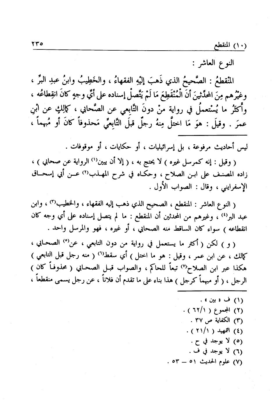 النَّوْعُ الْعَاشِرُ: الْمُنْقَطِعُ: الصَّحِيحُ الَّذِي ذَهَبَ إِلَيْهِ الْفُقَهَاءُ، وَالْخَطِيبُ، وَابْنُ عَبْدِ الْبَرِّ وَغَيْرُهُمْ مِنَ الْمُحَدِّثِينَ أَنَّ الْمُنْقَطِعَ مَا لَمْ يَتَّصِلْ إِسْنَادُهُ عَلَى أَيِّ وَجْهٍ كَانَ انْقِطَاعُهُ، وَأَكْثَرُ مَا يُسْتَعْمَلُ فِي رِوَايَةِ مَنْ دُونَ التَّابِعِيِّ، عَنِ الصَّحَابِيِّ كَمَالِكٍ، عَنِ ابْنِ عُمَرَ. وَقِيلَ: هُوَ مَا اخْتَلَّ مِنْهُ رَجُلٌ قَبْلَ التَّابِعِيِّ مَحْذُوفًا كَانَ أَوْ مُبْهَمًا، كَرَجُلٍ. وَقِيلَ: هُوَ مَا رُوِيَ عَنْ تَابِعِيٍّ أَوْ مَنْ دُونَهُ قَوْلًا لَهُ أَوْ فِعْلًا، وَهَذَا غَرِيبٌ ضَعِيفٌ.