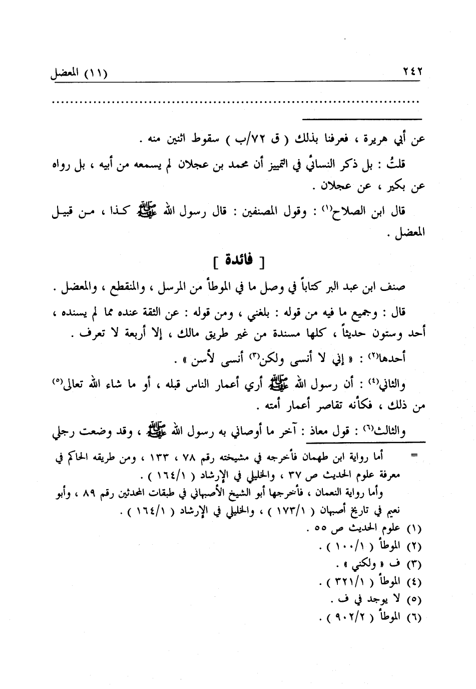 صَنَّفَ ابْنُ عَبْدِ الْبَرِّ كِتَابًا فِي وَصْلِ مَا فِي الْمُوَطَّأِ مِنَ الْمُرْسَلِ وَالْمُنْقَطِعِ، وَالْمُعْضَلِ. قَالَ: وَجَمِيعُ مَا فِيهِ مِنْ قَوْلِهِ بَلَغَنِي، وَمِنْ قَوْلِهِ، عَنِ الثِّقَةِ عِنْدَهُ مِمَّا لَمْ يُسْنِدْهُ أَحَدٌ وَسِتُّونَ حَدِيثًا، كُلُّهَا مُسْنَدَةٌ مِنْ غَيْرِ طَرِيقِ مَالِكٍ، إِلَّا أَرْبَعَةً لَا تُعْرَفُ، أَحَدُهَا: «إِنِّي لَا أَنْسَى وَلَكِنْ أُنَسَّى لَأَسِنَّ» ، وَالثَّانِي: «أَنَّ رَسُولَ اللَّهِ - صَلَّى اللَّهُ عَلَيْهِ وَسَلَّمَ - أُرِيَ أَعْمَارَ النَّاسِ قَبْلَهُ، أَوْ مَا شَاءَ اللَّهُ تَعَالَى مِنْ ذَلِكَ، فَكَأَنَّهُ تَقَاصَرَ أَعْمَارَ أُمَّتِهِ» ، وَالثَّالِثُ: قَوْلُ مُعَاذٍ: «آخِرُ مَا أَوْصَانِي بِهِ رَسُولُ اللَّهِ - صَلَّى اللَّهُ عَلَيْهِ وَسَلَّمَ - وَقَدْ وَضَعْتُ رِجْلِي
